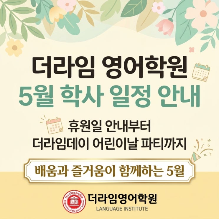 더라임영어학원 5월 학사 일정 안내 아이들의 성장과 즐거움이 함께하는 더라임영어학원입니다. 안녕하세요 단대동 엄마들 사이에서 소문난 영어학원, 단대동 영어학원입니다. 어느덧 따뜻한 봄이 깊어가고, 아이들이 더욱 활기차게 학습에 집중하는 5월이 다가오고 있습니다. 이번 달에도 아이들의 학습 흐름이 끊기지 않도록, 그리고 즐겁게 영어를 경험할 수 있도록 체계적인 학사 일정을 준비했습니다. 아이들의 학습과 경험이 균형 있게 이루어질 수 있도록 연간 계획을 바탕으로 운영하고 있습니다. 5월 주요 일정 안내 ✔ 5월 1일(금) : 노동절 휴원 ✔ 5월 4일(월): 정상수업 진행 ✔ 5월 6일(수) : 더라임데이 (어린이날....... <img src="https://blogthumb.pstatic.net/MjAyNjA0MjFfMjQy/MDAxNzc2NzcxMTA4Mzky.D8hnxT29lkQwZumVBzFR02tJehUGuHYcZ6m-kLCTEnMg.zXjiH-JjoAYC3aWt4sqRrS7tzFH4be4Bp_UZKtGF0b8g.JPEG/900_file_1776770978455.jpg?type=s3" />