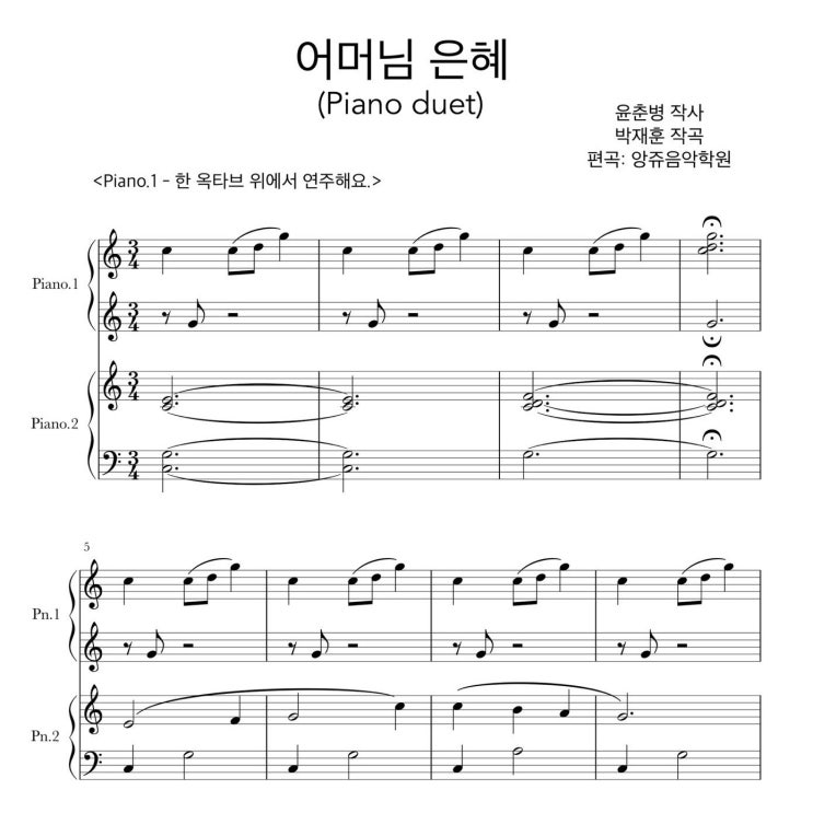 어머님 은혜 듀엣 (4핸즈) 악보입니다. 앙쥬의 어느 똑똑이 자매와 똑똑이 남매를 위해 만들었어요. 아이들이 재미있다고 하네요. ㅎㅎ 제1 피아노는 바이엘 중급 난이도, 제2 피아노는 바이엘 고급~체르니 100 초급 난이도 입니다. 쉽고 재미있도록, 그러면서도 풍성한 소리가 나도록 섬세히 제작하였습니다. 악보 구매: https://www.mapianist.com/sheet/161733 행복한 음악가들의 모임 앙쥬음악학원 <img src="https://blogthumb.pstatic.net/MjAyNjA0MjFfOTYg/MDAxNzc2NzAxMjI0Njgw.tQvO1XNqoJG1YVvpDXMxt56fg3ESdbXaurpF7MVD-3sg.qhMtP-Qj5vaNdcYSCrsI5SsQQG2YOmP8HkSCryVTzfcg.JPEG/output%A3%DF1018036567.jpg?type=s3" />