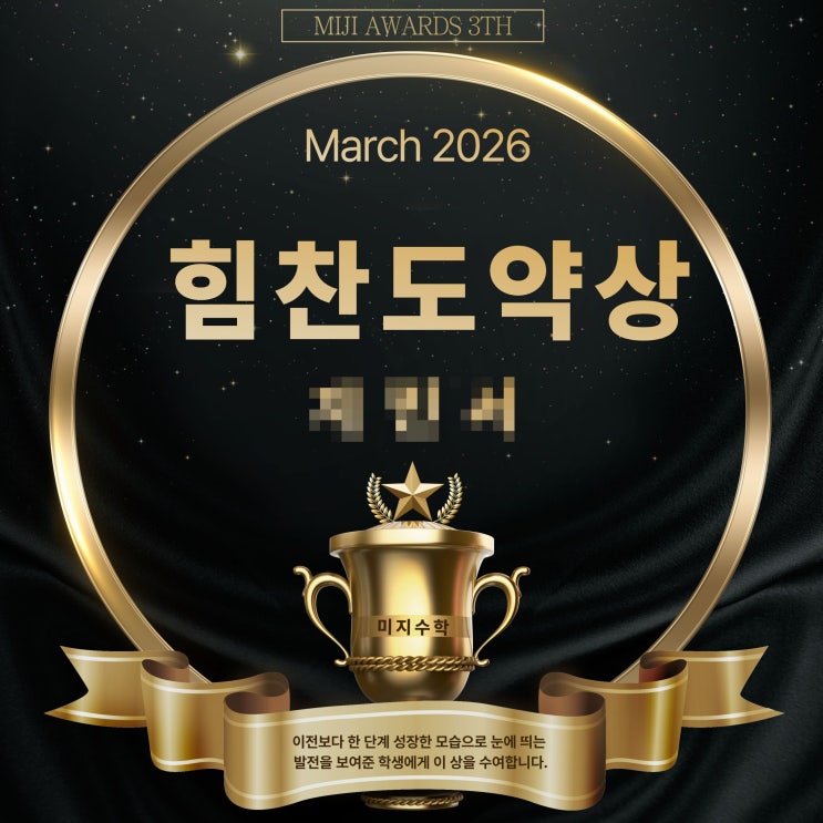 안녕하세요! 우리 아이들의 수학을 책임질 미지수학 미지쌤이예요.♥ 새 학기가 시작된 3월, 우리 반에서 가장 눈에 띄는 성장을 보여준 학생에게 힘찬 도약상을 수여했습니다. 이번 도약상은 단순히 결과가 아니라, 이전보다 한 단계 성장한 모습과 꾸준한 노력, 그리고 변화된 태도를 기준으로 선정했습니다. 수상한 학생은 학습 태도와 참여도 모두에서 확연한 발전을 보여주며 주변 친구들에게도 좋은 자극이 되어주었습니다. 2026년 2월, "힘찬도약상"을 시상했습니다. 힘찬 도약상은 성적의 높고 낮음이 아니라, 이전보다 나아진 모습과 스스로를 변화시키려는 노력, 그리고 꾸준히 성장해 나가는 태도를 격려하기 위한 상입니다....... <img src="https://blogthumb.pstatic.net/MjAyNjA0MDhfMjMx/MDAxNzc1NjIzOTYxMjU5.JQ_u37dhH36TWg7VaXKjHmc0YrlQ6mvIm1-ich7zNd8g.ezZMdcxOo7Q1U7Ne2BadawJH8XOp-PB5j5TwEH4MLCog.JPEG/%BF%F9%BA%B0%BB%F3_%C7%D0%BF%F8.jpg?type=s3" />