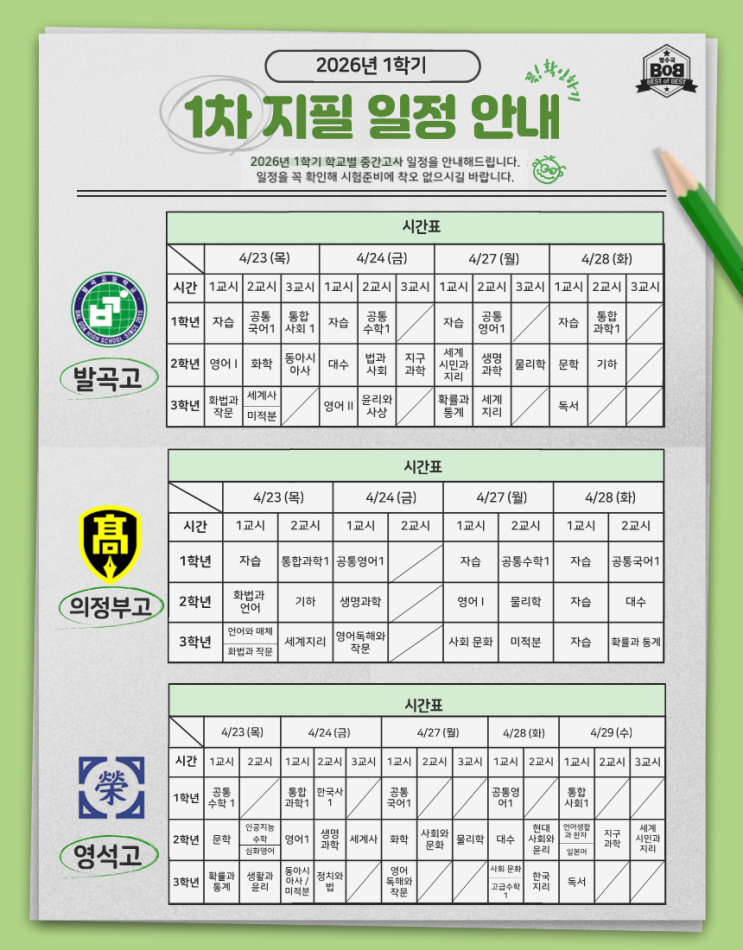 2026년 고등부 1학기 1차 지필고사가 얼마 남지 않았습니다! 학교별 시험 일정을 한눈에 볼 수 있도록 정리해두었으니 참고해 주세요~ 또한 시험 일정에 맞춘 과목별 직전 대비 시간도 함께 안내드리니 꼭 확인 부탁드립니다! 자세한 내용은 아래 이미지를 참고해 주세요 :) 남은 기간까지 잘 준비해서 좋은 결과 있길 바랍니다! 영수국밥이 응원합니다! <img src="https://blogthumb.pstatic.net/MjAyNjA0MTBfMzgg/MDAxNzc1ODExMzk4NjYx.ctNSDcs9EiFdahCRN5Z4OzZ9adK-UjYt3WtRtr1d0PQg.PEVmnSJVveoKa_iaUbNJHHUFdlb_sUsA-WIqGXWMIq4g.PNG/%C3%D6%C1%BE.png?type=s3" />