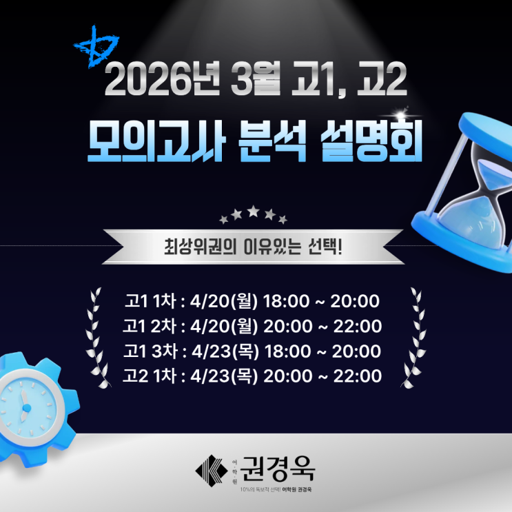 안녕하세요~^^ 의정부에서만 17년 이상, 최상위권의 이유있는 선택! 본질적 영어 실력과 단단한 학습 습관을 함께 만들어가는 영어전문 교육, 권경욱 어학원입니다. 우리 아이 성적, 지금 위치가 정확히 어디일까요? 3월 모의고사가 끝나면 많은 학부모님들이 비슷한 고민을 하십니다. 점수는 나왔는데 해석이 어렵고 이 성적으로 어디까지 가능한지 모르겠고 지금 공부 방향이 맞는지도 확신이 안 서는 상황 사실 이 시점에서 가장 중요한 건 ‘점수 자체’가 아니라 그 점수를 어떻게 해석하고, 어떻게 다음 전략으로 연결하느냐입니다. 그래서 단순 결과 확인이 아닌, 입시 기준으로 다시 읽는 분석이 필요합니다. 권경욱어학원에서는 3월 모....... <img src="https://blogthumb.pstatic.net/MjAyNjA0MTVfMjI4/MDAxNzc2MjEyMjAwMDU0.77MSO1Gq6dzFjQ7g3oqHJsvuva28l-So0XBqIuMf5hYg.C_6Ojd73OpVEfNmMrn55C6XcuTSdkPQO8WDANev1vogg.PNG/%BD%C5%B0%EE%B5%BF_%BF%B5%BE%EE%C7%D0%BF%F8.png?type=s3" />