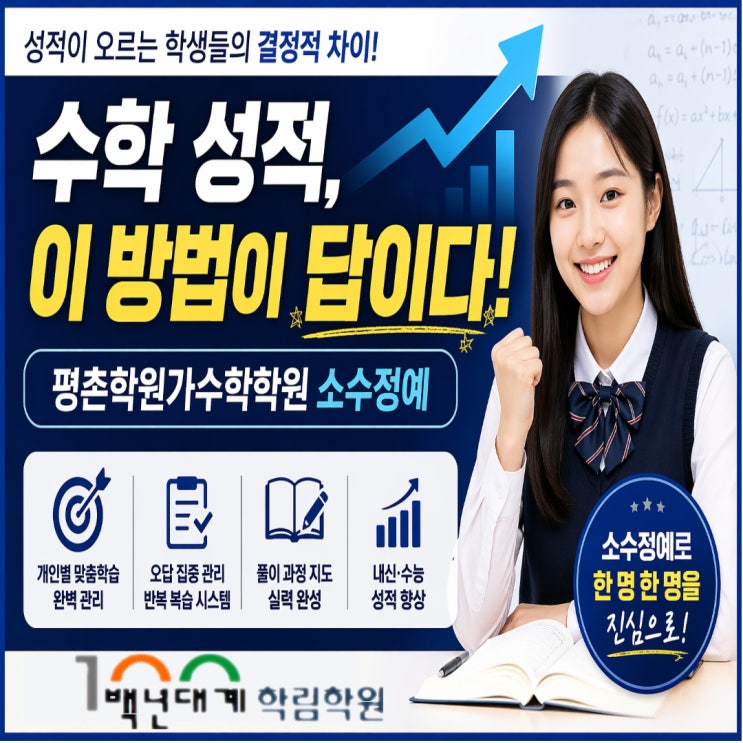안녕하세요? 평촌학원가수학학원 소수정예 및 밀착관리 30여년의 전통 백년대계학림학원입니다. 수학 성적이 잘 오르는 학생과 계속 제자리인 학생의 차이는 무엇일까요? 같은 시간을 공부해도 결과가 완전히 달라지는 이유, 많은 학부모님과 학생들이 궁금해하십니다. 특히 평촌학원가수학학원 소수정예 시스템을 찾는 이유도 결국 이 차이를 만들기 위해서입니다. 결론부터 말씀드리면, 수학 성적은 ‘재능’보다 방법과 관리의 차이에서 결정됩니다. 실제로 수많은 학생 데이터를 분석해 보면 성적이 오르는 학생들에게는 공통된 특징이 있습니다. 평촌학원가수학학원 관리에서부터 차이가 난다 1. 수학 성적이 오르는 학생들의 공통점 1) 오....... <img src="https://blogthumb.pstatic.net/MjAyNjA0MjRfNTcg/MDAxNzc3MDA2NTY1MDIz.-40N0AZJHT_nP-eLI24n8BHOHx5V8UMRkzJD3GP8Yr8g.r5mhynMwGucJ9x8lhBxPBkCMCaQ1XhHE2PtcgGRmn7cg.JPEG/%C1%A6%B8%F1%C0%BB_%C0%D4%B7%C2%C7%CF%BC%BC%BF%E4.jpg?type=s3" />