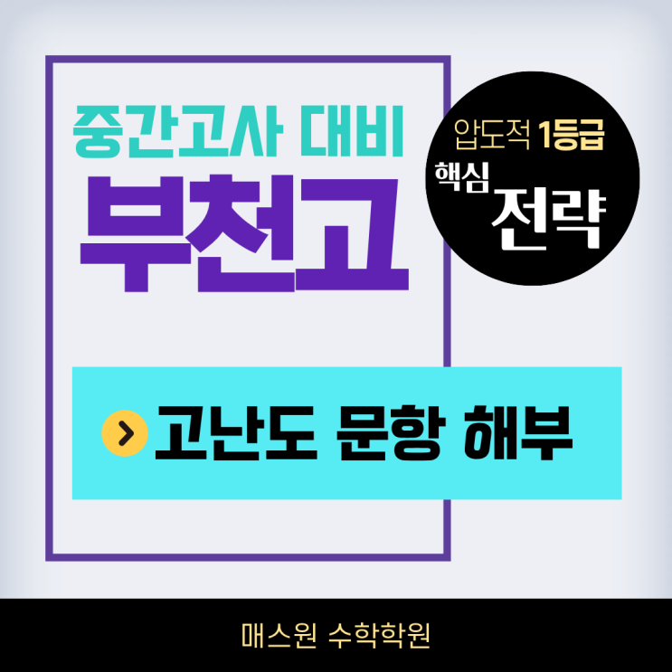 안녕하세요! 부천 상동 수학의 자존심, 매스원수학학원입니다. 새 학기가 시작되고 어느덧 중간고사가 코앞으로 다가왔습니다. 부천고등학교 수학 시험은 변별력 있는 고난도 문항들이 포함되어 있어 철저한 전략이 필요한데요. 오늘은 부천수학, 상동수학학원 매스원에서 분석한 2025년 부천고 1학기 중간고사 고난도 문항들을 통해 1등급을 결정짓는 2026년 중간고사 고난도 문제 핵심 대응 전략을 소개합니다! 1. 2025년 부천고 15번: 다항식의 나머지 정리 나머지 정리는 부천고 시험에서 매년 빠지지 않는 '단골 고난도' 영역입니다. 많은 학생이 미지수를 ax3+bx2+cx+d로 잡고 시간을 허비하다 실패하곤 합니다. 문제 핵심: 조건....... <img src="https://blogthumb.pstatic.net/MjAyNjA0MTFfMjQy/MDAxNzc1ODk5MjA0Mzc2.XCI2hnDTRLfstHChKPYtjg9dCkT2JzbyUCVs_TKn9cUg.oq0vE7unHBnVmWoknABPmqXV-EVXSuPe5kQ4_hEi02Ug.PNG/%BA%CE%C3%B5%B0%ED_%C1%DF%B0%A3%B0%ED%BB%E7%B4%EB%BA%F1_%BB%F3%B5%BF%BC%F6%C7%D0_%B8%C5%BD%BA%BF%F8%BC%F6%C7%D0%C7%D0%BF%F8.png?type=s3" />