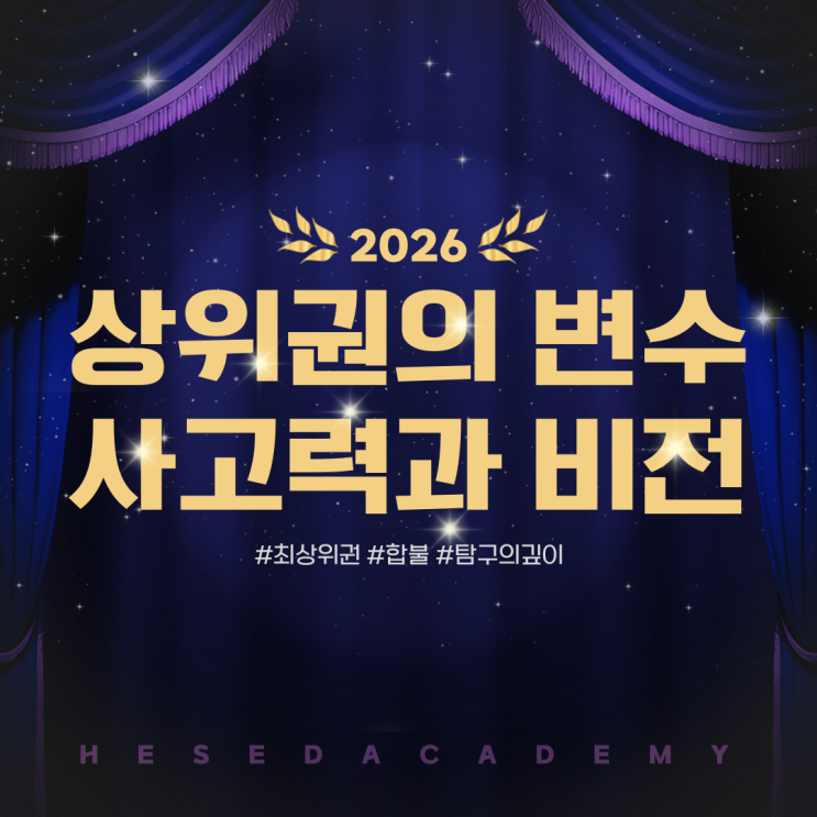 안녕하세요. 수학·국어 전문 헤세드 입시학원입니다. 오늘 헤세드가 준비한 입시정보는 최상위권 합불 가르는 '사고력과 비전'입니다! 서울대와 의과대학 등 최상위권 대학의 합격 여부는 더 이상 단순한 내신 등급이나 수능 점수로 설명되지 않습니다. 상위권 학생들 사이에서는 성적 격차가 크지 않기 때문에, 실제 당락은 정량지표 밖의 요소에서 갈립니다. 그 핵심이 바로 사고력과 비전이다. 학생부종합전형이 확대되면서 대학들은 결과로서의 성적보다 학습의 과정과 방향성을 더욱 중시하는 평가로 이동했습니다. 동일한 1등급을 받은 학생이라도 어떤 이는 합격하고, 어떤 이는 탈락하는 이유는 여기에 있습니다. 대학은 더 이....... <img src="https://blogthumb.pstatic.net/MjAyNjA0MjNfNDAg/MDAxNzc2OTQ4NjQ4Nzgz.J15jEzeBsHlo2XVsUvUC9McM299Swy0A0waeHUxBHCgg.wVuSEIzeuMJt4CbMMQndy12A8cVk5BUBRV_x66Oi97gg.PNG/%C1%A6%B8%F1%C0%BB-%C0%D4%B7%C2%C7%D8%C1%D6%BC%BC%BF%E4_-001_%282%29.png?type=s3" />