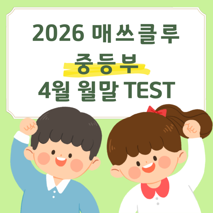 안녕하세요. 차별화된 경쟁력을 약속하는 화정 수학학원, 매쓰클루학원 중등부입니다. 따뜻한 봄기운이 느껴지는 4월, 저희 매쓰클루학원 중등부에서는 4월 9일(목)에 2026년도 두 번째 월말 TEST를 진행했습니다! 어느덧 두 번째 시험인 만큼, 아이들도 조금씩 시험에 대한 긴장감과 함께 스스로의 실력을 점검해보는 시간을 자연스럽게 받아들이는 모습이 인상적이었습니다. 이번 월말 TEST는 점수만을 확인하는 자리가 아닌 그동안 배운 내용을 얼마나 잘 이해하고 있는지, 또 앞으로 어떤 부분을 더 보완해야 할지를 함께 확인해보는 의미 있는 시간이었는데요. 차분한 분위기 속에서 끝까지 집중하는 학생들의 모습에서 한층 성장한 모습을....... <img src="https://blogthumb.pstatic.net/MjAyNjA0MTFfMTYy/MDAxNzc1ODgyNjE5MTcz.oGhG5GzUDl-mfDuQ0CN_A1zo_2GWMykbXWQH6TNBwiMg.h24Xs3wdXpYv6oC25YEIIveZ9AHKnodY1zoyNngzQzcg.PNG/%3F%A0%9C%EB%AA%A9%EC%9D%84-%3F%9E%85%3F%A0%A5%3F%95%B4%EC%A3%BC%EC%84%B8%3F%9A%94_-001_%2810%29.png?type=s3" />