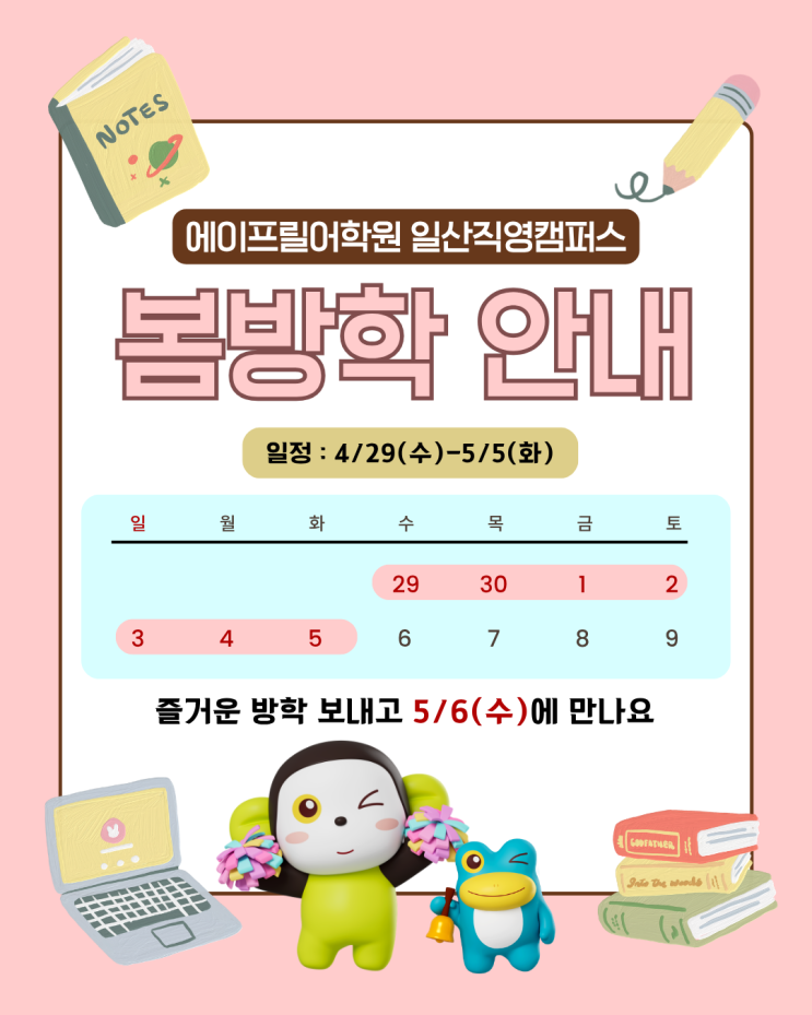 안녕하세요. 에이프릴어학원 봄방학안내 드려요! 4/29(수)-5/5(화)까지 즐거운 방학을 보내고 5월 6일(수)에 만나요 <img src="https://blogthumb.pstatic.net/MjAyNjA0MjVfMTM5/MDAxNzc3MDg0OTczODkw.1cnvWNTXinPSxVFd5ly_5B4KuaPrkNI2YIyzamu0RRUg.lm6uaNVEbCZ-pm2_0ClAUuEFYb-BD7LzBXyhZEwAmwAg.PNG/%B9%E6%C7%D0%BE%C8%B3%BB.png?type=s3" />