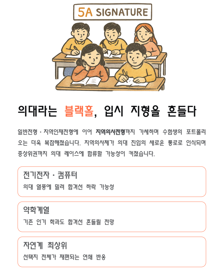 2027 입시는 단순한 ‘점수 싸움’ 아닌 ‘전략이 필요한 고차방정식’ 되었다. 2027학년도 상위권 대입 지형이 거대한 격변의 소용돌이에 직면했습니다. 의대 모집 인원 확대와 더불어 새롭게 도입되는 ‘지역의사제’는 단순히 의대 문턱을 낮추는 차원을 넘어, 자연계 최상위권 전체의 선택지를 뒤흔드는 변수가 되고 있습니다. ‘지역의사제’로 인해 이제 입시는 누가 더 높은 점수를 받느냐를 넘어, 어느 권역에서 어떤 전형을 공략하느냐는 ‘정보와 전략의 싸움’으로 진화되었습니다. 의대라는 거대한 ‘블랙홀’, 입시 지형의 근간을 흔들다! 이번 입시의 핵심은 의대 지원 구조의 세분화입니다. 일반전형과 지역인재전형에 이어 지역....... <img src="https://blogthumb.pstatic.net/MjAyNjA0MTdfMjg3/MDAxNzc2NDIwNjkwMDA2.mg9kQS9lliVYIC-g39RZMsGus_ni4-JLtJhYbvOi_X4g.SfGDOWs56fsK0VkBEK8tXEy7QNNdQJJ85xR2Rrp5YoMg.PNG/image.png?type=s3" />