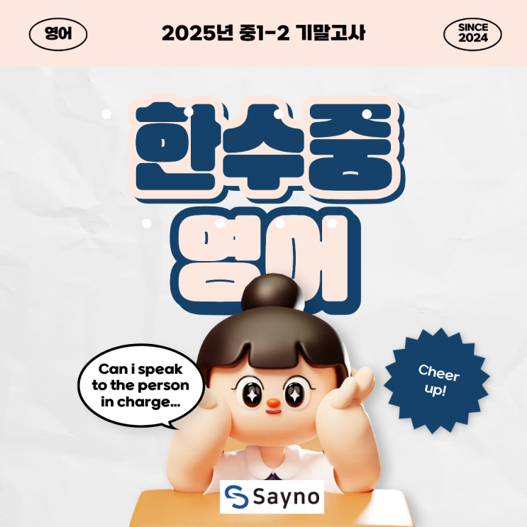 안녕하세요. 한수중 영어학원 대치세이노입니다. 오늘은 25년 중2-1 중간고사 기출분석을 해보려 하는데요. 중간고사 보기 전 학교의 시험 특징을 파악해보고 효율적인 학습 계획을 세워보는데 도움이 되길 바랍니다. 유형별 난이도 & 시험총평 출제유형별 난이도 - 단어 : 하1, 중1 - 대화문 : 하2, 중2 - 독해 : 하4, 중5, 상2 - 어법 : 하1, 중1, 상3 시험총평 - 출제 난이도 ★★★★☆ - 유형별 균형있게 출제되었고 독해에서는 수능형과 서사형 지문에 함께 출제되는 특징이 있었습니다. - 후반부 문항들에서는 내용 일치와 추론 문제가 중심이 되었습니다. - 서술형은 문장 구조를 정확히 이해하고 적용하는 연습이 필요한 것으로 보....... <img src="https://blogthumb.pstatic.net/MjAyNjA0MTdfMzEg/MDAxNzc2NDI2NDY1MDYx.4r8A_kfmkSSuGr7jsXldoku1l0BIStCJnT1tzVY33Ugg.qDT0xa0hdZaOWm0jOK6cTQx0WVo6KeVeSH1SpVN8A8Ig.PNG/1.png?type=s3" />