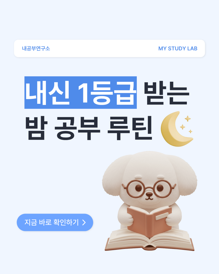 안녕하세요. 내공부연구소입니다! 내신 1등급 받는 밤 공부 루틴을 공유합니다. 하루를 어떻게 마무리하는지에 따라 다음 날의 집중도가 달라집니다. 무리한 계획보다 꾸준히 지킬 수 있는 루틴을 만드는 것이 핵심입니다. 위 시간표를 참고해서 자신에게 맞는 공부 리듬을 만들어보세요. #내공부연구소 #리딩오션일산후곡점 #일산국어 #후곡국어 #일산과학 #후곡과학 ☎ 교육문의 과학 010-4972-5096 국어 010-8672-5096 <img src="https://blogthumb.pstatic.net/MjAyNjA0MjBfMjI5/MDAxNzc2NjY3OTg1NTg2.GVHSExhXc2vwmEgfnCTmpoT1SE1JLM1ooYl5h6Sa9bEg.oxHDmi4BsYhZNK37lQZt8AJTxHZ9Hn0C6Xsi2UeLU8Mg.PNG/1.png?type=s3" />