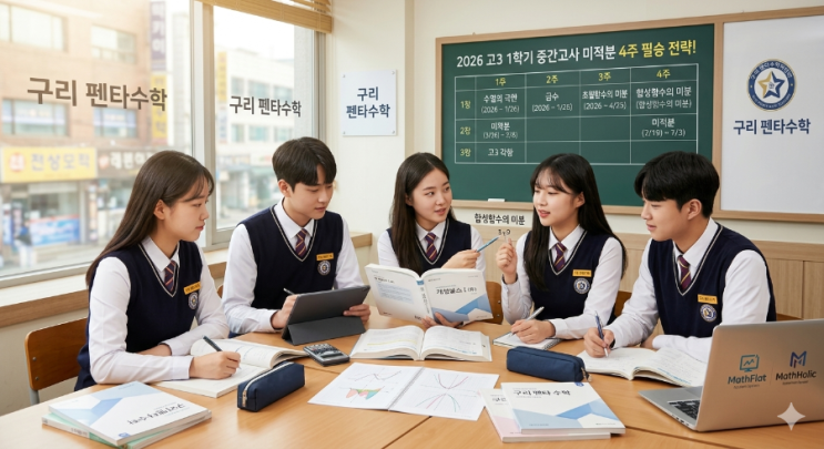 "미적분, 계산에 먹히지 마라!" 펜타수학의 중간고사 대비 4주 완성 로드맵(수열의 극한부터 합성함수 미분까지) 안녕하세요, 구리 수험생들의 든든한 수학 파트너 **펜타수학**입니다. 2026학년도 첫 시험인 1학기 중간고사가 다가오고 있습니다. 특히 고3 학생들에게 **'미적분'**은 방대한 양과 복잡한 계산 때문에 가장 큰 부담으로 다가오는 과목이죠. 이번 천재교육(류) 교과서 범위를 바탕으로, 펜타수학이 제안하는 **미적분 4주 집중 공략법**을 공개합니다! ### 이번 시험 핵심 범위 분석 이번 중간고사는 **수열의 극한**부터 **여러 가지 미분법(합성함수의 미분)**까지가 주된 승부처입니다. * **등비급수....... <img src="https://blogthumb.pstatic.net/MjAyNjA0MDhfNjgg/MDAxNzc1NjI5NjgxMjM0.GlKKgttAmR7nhi6hMAlMOIxyIa0N7wa5ukOkxjewWH4g.jIYpzBfuTyxu3E7unLC8pBOabytKJ6kqTF3iW-B1n6Mg.PNG/900%A3%DF1775629659998.png?type=s3" />