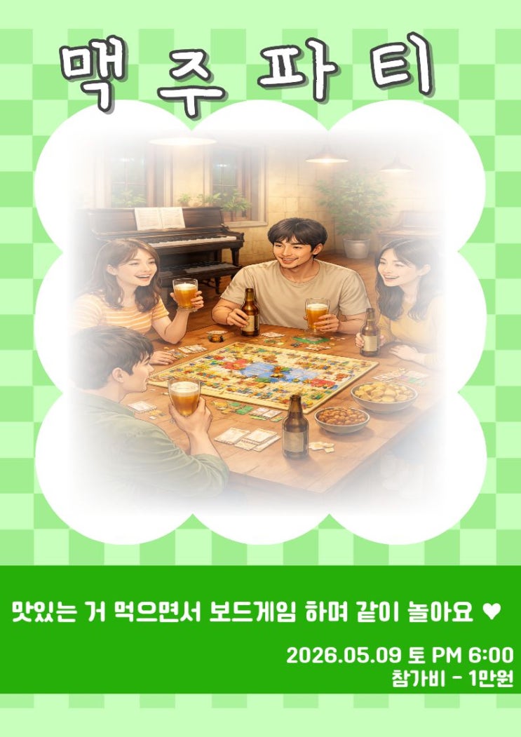 안녕하세요! 위드피아노 구리점 입니다 요즘 갑자기 날씨가 엄청 더워졌죠!! 이제 여름이 찾아오나봐요 여름 하면 시원한 맥주 아니겠어요?! 학원에서 시원하게 맥주 마시면서 보드게임도 하고 맛난것도 먹고 재밌게 같이 놀아요!!❤️ 2026.05.09 토요일 PM 6:00 많이많이 참여해주세요 같이 놀아요 여러분 ❤️ 구리 피아노 학원 위드피아노 에서는 1 : 1 개인 레슨으로 수강생분들의 성향과 취향에 맞춰서 맞춤 레슨을 진행하고 있습니다! 재즈를 쉽고 재밌게 배워보고 싶은 분들 누구나 편하게 문의 주세요 ~! [구리성인피아노학원 위피구리점] 주소: 경기도 구리시 검배로 5 , 3층 위치: 스타벅스 구리 돌다리점 건물....... <img src="https://blogthumb.pstatic.net/MjAyNjA0MTdfNCAg/MDAxNzc2NDIyMDU0NTA0.w-dqYrQJAldiQfCEbs5_WVnHGzVooT2JfySshVqI5Usg.IL3ghkUUViJcaJzk__SA-m-gqaxr1Kxt23Z464B4ShIg.JPEG/%C1%A6%B8%F1%C0%BB_%C0%D4%B7%C2%C7%D8%C1%D6%BC%BC%BF%E4._%2811%29.jpg?type=s3" />