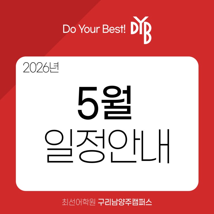 안녕하세요 최선어학원 구리남양주캠퍼스입니다. 5월 일정 안내드립니다. 5월 일정 안내 4월 28일~5월 11일 초/중등 에세이 2분기 3회차 5월 1일 노동절 휴무 4월 30일 / 5월 4일 어린이 날 행사 5월 5일 어린이 날 휴무 5월 12일~5월 23일 초/중등 에세이 2분기 4회차 5월 16일 스피치 컨테스트 결선 5월 25일 부처님 오신 날 대체 공휴일 휴무 5월 26일~6월 8일 초/중등 에세이 2분기 5회차 5월 가정의 달을 맞아, 자녀를 위해 늘 애써주시고 아낌없는 사랑을 보내주시는 학부모님들께 깊은 감사의 말씀을 전합니다. 아이 한 명의 성장은 가족의 사랑과 기다림 그리고 믿음 위에서 이루어진다고 생각합니다. 학부모님께서 보내주시는....... <img src="https://blogthumb.pstatic.net/MjAyNjA0MjJfNCAg/MDAxNzc2ODM2ODM2NDM5.-J8F9RiOUiAkIwIYXt1hFIJzhtaqT-1wP2XKFWsAB7cg.-0s8Vr3OxjqdfZSeGhBFCHi6lilQsuwti1F67274SxIg.JPEG/2026_.5%BF%F9%C0%CF%C1%A4%BE%C8%B3%BB.jpg?type=s3" />