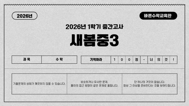 안녕하세요 항상 "대입"까지 바라보고 초등부터 고등까지 수학을 가르치는 바른수학교육 한 학원입니다. 중학교 시험은 정말 범위대비 문제의 유형이 제한적이라 거의 대다수 연습한 문제에서 출제되고 있습니다. 당연히 조금 더 어려운 문제로 연습하면서, 학생들이 당황하지 않도록 만드는 것, 시간을 최대한 빠르게 풀도록 하면서 본인이 할 수 있는 실수를 체크해내고 고치는 것! 늘 준비하면서도 아쉬운 부분이 있다는게 속상하고 답답합니다. 이번 새봄중 시험은, 쉬웠습니다. 실수가 없었어야 했습니다. 다시 스스로 반성하게 되는 시험입니다. 저희가 준비한 시험지 비교 분석해드립니다. <img src="https://blogthumb.pstatic.net/MjAyNjA0MjlfMjI5/MDAxNzc3NDM1NjY0MTA2.jSA9bbMYwVAGNhW5tty2A-dhuL67QSwO7mJGh55fKaQg.Ly4aWkqyAffRY-7FQTDmuBU8qnSJiT702Y40Ovc07CAg.PNG/1.png?type=s3" />