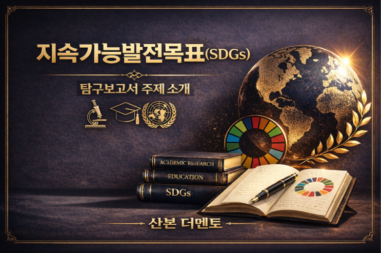 안녕하세요. 초등부터 수능까지, 결과로 신뢰를 만들어가는 더멘토영수학원 원장 문정주입니다. 산본 궁내중학교 디퍼러닝 준비를 시작하면서 학생들이 중학교는 물론 고등학교까지 활용할 수 있는 탐구보고서 주제 선정의 중요성을 다시 한 번 느끼고 있습니다. 그래서 오늘은 탐구보고서의 핵심 주제로 활용할 수 있는 전 세계 공통 기준인 유엔(UN)의 지속가능발전목표(SDGs)를 학생과 학부모님 모두 이해하기 쉽게 정리해보겠습니다. “지속가능발전목표(SDGs) 17개 완벽 정리” 요즘 학생부, 탐구보고서, 면접까지 “주제의 깊이”가 정말 중요해졌습니다. 특히 많은 학생들이 선택하는 주제가 바로 지속가능발전목표 (SDGs) 입니다. 오늘은....... <img src="https://blogthumb.pstatic.net/MjAyNjA0MDhfMTAw/MDAxNzc1NjA3MjYwNzE5.5MKIzAeuGjcdDHKPDm9cohX6wKc4nRnXgGsEZMKDwXog.tkQoVLuTKeoEqTNb67ZM8EYsxJzLZ2qAXgdC_t7nHU0g.PNG/1.png?type=s3" />
