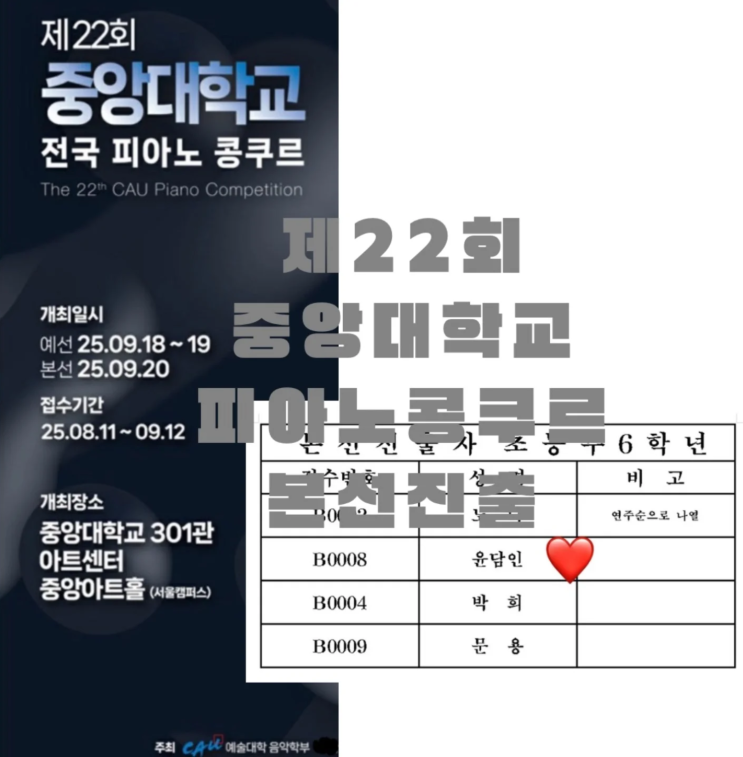 안녕하세요! 수클래식 대표원장 pianist초이, 최주영입니다 아이들 연습하는 소리로 연습실이 하루 종일 꽉 차 있는 요즘이에요 저도 같이 긴장하면서 하루하루 보내고 있습니다 제 22회 중앙대학교 피아노콩쿠르 본선진출 ✨ 제 22회 중앙대학교 피아노콩쿠르 ✨ 본선 진출 중앙대학교 피아노콩쿠르는 대학에서 주최하는 콩쿠르인 만큼 전공을 준비하는 학생들, 그리고 실력 있는 참가자들이 대거 몰리는 규모도 크고 수준도 매우 높은 권위 있는 콩쿠르입니다 특히 대학 콩쿠르 특성상 심사 기준 자체가 훨씬 엄격하고 음악적인 완성도와 표현력까지 세밀하게 평가되기 때문에 초등학생이 도전하기....... <img src="https://blogthumb.pstatic.net/MjAyNjA0MDVfNDkg/MDAxNzc1Mzc0MjkwMTIz.RGFkiekfzuCBSV2QlYonQM2y1LrrqL7jyxae5tI6SrIg.Z12zSSFLL9DmzA_oCKbnB01_HJpDr-PYppr7A_Aw4hgg.PNG/image.png?type=s3" />