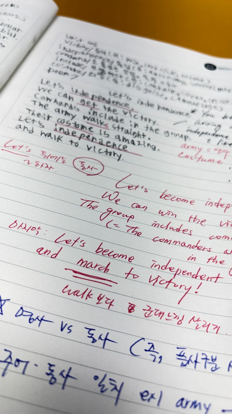 한 권의 노트, 그 이상의 의미 이 노트는 단순한 숙제가 아닙니다. 아이의 글을 보면 ✔ 문장을 ‘맞추는 것’이 아니라 ✔ 문장을 ‘이해하려는 과정’이 보입니다. 이 아이는 ‘외우는 공부’를 하고 있지 않습니다. 단어를 적고 끝나는 것이 아니라 유의어를 연결하고, 의미를 확장하고 , 직접 문장을 만들어봅니다. 단어를 고르고, 문장을 만들고, 더 좋은 표현으로 다시 바꾸는 과정 이게 바로 진짜 영어 실력입니다. 첨삭은 ‘틀린 것 찾기’가 아닙니다 예를 들어 이런 문장이 있었어요. The army walk straight. → ✔ The army walks straight. The group include in the group. → ✔ The group includes… 이건 단순히 틀린 걸 고치는....... <img src="https://blogthumb.pstatic.net/MjAyNjA0MTZfMTcy/MDAxNzc2MzMzNDIwMzYz.tpaclPD4Bw2wrrEKRSqUePjoYF1HHWiJ8FCbGRKa6qIg.AzOl9O1V7dTW1Jm3H4kB2rlVvwk9Z1booU2aSdR0Zw4g.JPEG/KakaoTalk_20260415_135341529.jpg?type=s3" />