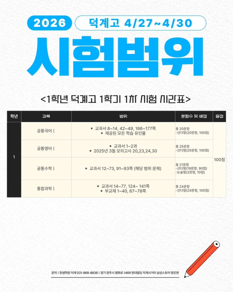 덕계고 시험 일정은 “4월 27일 - 4월 30일“입니다. 이번에는 시험 범위를 공유하도록 하겠습니다! 학년별 시험 범위이며, 영어는 프린트로 게시가 되어 정확한 시험 범위를 정리했습니다. 시험 막바지에 날씨가 덥습니다. 모든 학생들 힘냈으면 좋겠습니다:) #덕계고등학교 #덕계고 #덕계한샘학원 #1학기중간고사 (상담문의) 031.868.8838 <img src="https://blogthumb.pstatic.net/MjAyNjA0MTdfMTI3/MDAxNzc2NDE2NTY0NTk3.LeSTuD0HJzU9WJYyR-aMN_vzu2Q9DhzzC009XDcEOMQg.h6kOaKPdnIGQ4ASdlb8e0-uh907--JAFOCjZSLgVLWIg.JPEG/IMG%A3%DF9561.JPG?type=s3" />