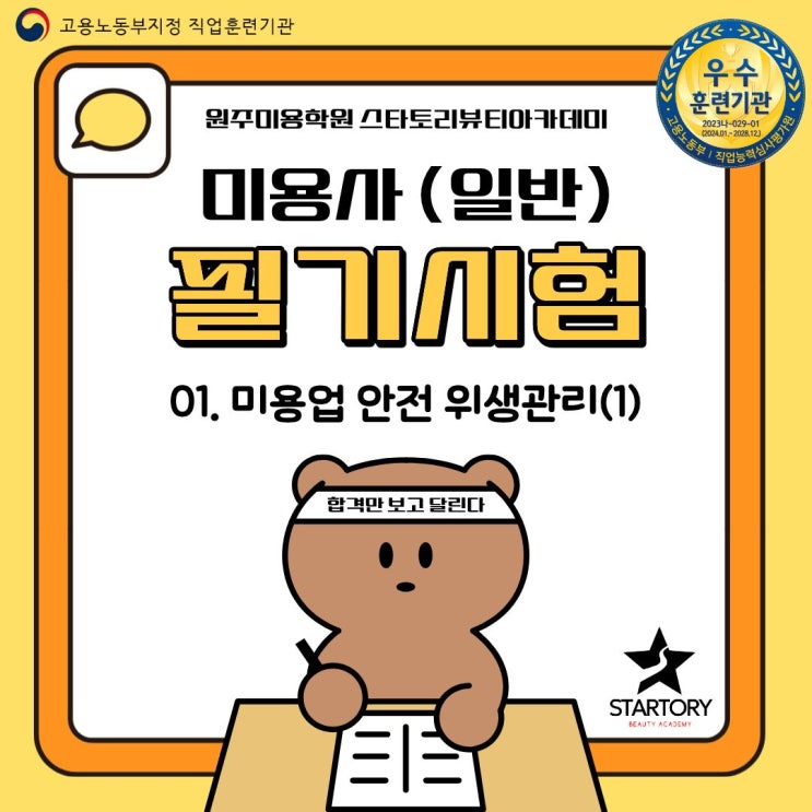 원주미용학원 스타토리뷰티아카데미 안녕하세요 원주미용학원 스타토리뷰티아카데미입니다. 미용사 필기시험 문제 수는 총 60문항이며, 60점 이상 점수를 취득하셔야 실기시험 응시 자격이 주어집니다. 오늘은 미용사(일반) 필기시험 대비 요점 정리를 보며 같이 공부해 보겠습니다. 미용의 이해 일반적 미용: 복식을 제외하고 얼굴, 머리, 피부 등에 물리적 · 화학적 시술을 하여 외모를 아름답고 건강하게 유지 · 발전시키는 행위이다. 공중위생관리법의 미용업: 손님의 얼굴, 머리, 피부 및 손톱 및 발톱 등을 손질하여 손님의 외모를 아름답게 꾸미는 영업이다. 미용의 목적 1️⃣외모를 건강하고 아름답게 관리하여 미적 표현 욕구를 충족 2....... <img src="https://blogthumb.pstatic.net/MjAyNjA0MTVfMjA2/MDAxNzc2MjIzODAxNjIy.pNCFD67D3--fiUfZ3l_jCyC5nT4Dfuvz5qghhFwVpawg.yekuCQo-HyIOM_rKmTs4M8Zj4ItzIX0bXGkGRMWnJmog.JPEG/1.jpg?type=s3" />