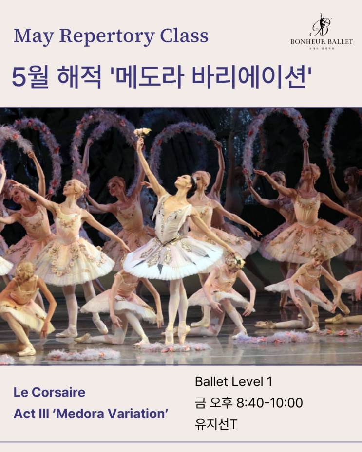 안녕하세요, 보네르발레학원입니다. 보네르발레학원의 레퍼토리 수업은 정해진 작품을 한 달간 반복 연습하며 동작의 완성도를 높이고, 그 안에서 표현력과 무대 감각을 자연스럽게 키워가실 수 있습니다.✨ 매달 다른 클래식 작품을 통해 다양한 음악과 안무 스타일을 경험해보세요. ☺️ 5월 Ballet Level 1 (금 20:40) Le Corsaire Act III ‘Medora Variation’ 5월 Ballet Level 1 수업에서는 해적 3막 중에서 '메도라 바리에이션'을 배워보겠습니다. 이 작품은 해적 두목 콘라드와 그의 연인 메도라, 그리고 파샤의 궁전에서 벌어지는 모험과 구출 이야기를 다루고 있으며, 웅장하면서도 낭만적인 무대로 유명합니다. 파트별로 천....... <img src="https://blogthumb.pstatic.net/MjAyNjA0MTZfNTMg/MDAxNzc2MzIzMzM4MTAy.VpRzbO8AsKbFYDHfMD-SJ0Pr3WlsqrGEqGuAbl-bduQg.5bnIwTOg5ow0afrGMyaHkp8qqtMHH4ggRwvAo47tkrMg.PNG/%B7%B9%C6%DB%C5%E4%B8%AE-%B0%F8%C1%F6-002.png?type=s3" />