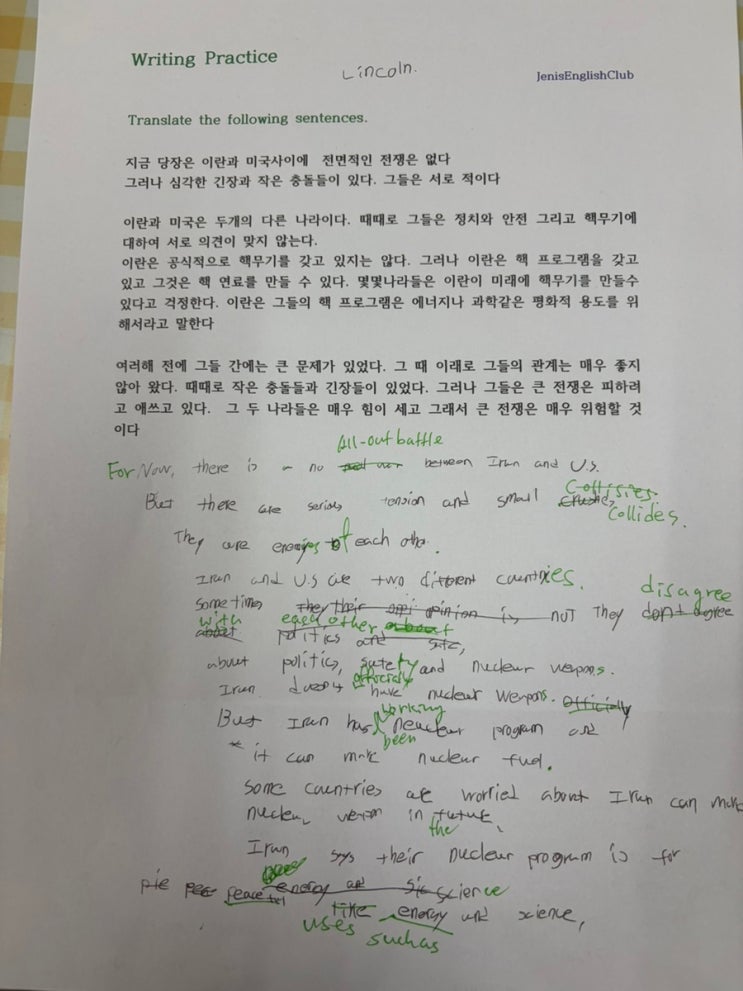 요즘 학생들은 바쁘기도 하고 생각하는걸 너무 귀잖아해서 궁여지책으로 한글지문을 주고 영어 writing을 해보았습니다 제법 잘 썼죠??!! 참고로 초등 6학년 남학생 입니다 <img src="https://blogthumb.pstatic.net/MjAyNjA0MTNfOSAg/MDAxNzc2MDYzNTYwMjE4.Wxh3ZyaLXd2vMsZHLkWZnYuEuLH4UQmUiwuZcOtejuYg.ZZ5BVyudWidbrxzIi7OlJBqKpBlnpJSznPHuPS8O2YAg.JPEG/IMG%A3%DF1875.jpg?type=s3" />