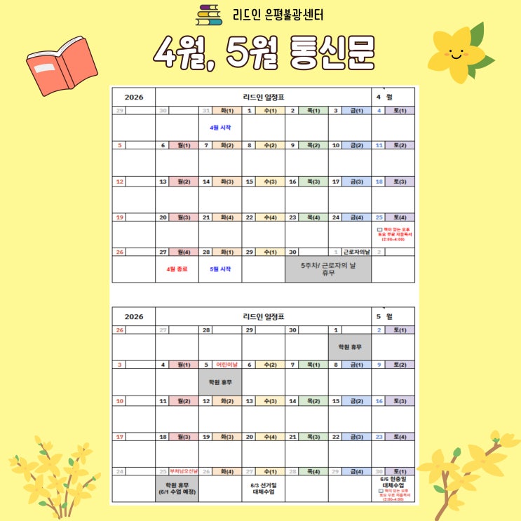 안녕하세요. 문해력 일번지, 독바위역 1번 출구 리드인 은평 불광 센터입니다 봄기운이 완연한 4월, 가정에 행복한 시간 보내고 계신지요? 곧 푸르름이 가득한 5월, 가정의 달이 다가옵니다 5월에는 공휴일 및 재량휴업일로 학사 일정에 변동이 있는 경우가 많아 학원 휴무일을 미리 안내드립니다. 리드인 5월 휴무일 안내 5월 1일 금요일 (근로자의 날) 5월 5일 화요일 (어린이날) -> 4월 28일 대체 수업 예정 5월 25일 월요일 (부처님 오신 날) -> 6/1 대체 수업 예정 ※ 위 날짜에는 수업이 진행되지 않습니다. 보강 안내 개인 일정으로 결석하는 경우에는 리드인 채널톡으로 보강을 신청해 주시면 시간 조율 후 진행해....... <img src="https://blogthumb.pstatic.net/MjAyNjA0MTJfNCAg/MDAxNzc2MDA1MTIxMjU3.yiosPbZWmHHCWZHAJ8-ccuoo0grq7FiT1SlKkYn3Xkkg.zb2AnXMGWWCOLUUzTlTymXm3JGVf_0BdG2ajUKdaHogg.JPEG/5_6%BF%F9-%B4%DE%B7%C2_-%BA%B9%BB%E7%BA%BB-001.jpg?type=s3" />