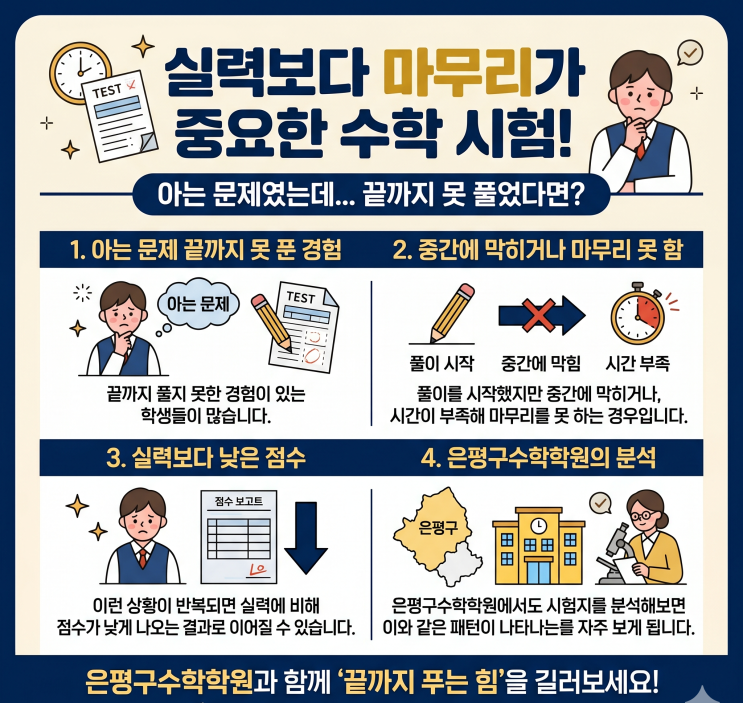 안녕하세요. 수풀림수학학원입니다 :) 수학 시험을 보면 아는 문제였는데 끝까지 풀지 못한 경험이 있는 학생들이 많습니다. 풀이를 시작했지만 중간에 막히거나, 시간이 부족해 마무리를 못 하는 경우입니다. 이런 상황이 반복되면 실력에 비해 점수가 낮게 나오는 결과로 이어질 수 있습니다. 은평구수학학원에서도 시험지를 분석해보면 이와 같은 패턴이 나타나는 경우를 자주 보게 됩니다. 그렇다면 문제를 끝까지 풀지 못하는 이유는 무엇일까요? ✅ 풀이 방향이 명확하지 않은 상태에서 시작합니다 문제를 보자마자 바로 계산부터 시작하는 경우가 있습니다. 하지만 풀이 방향이 정리되지 않은 상태에서 시작하면 중간에 막히기 쉽습니다. ....... <img src="https://blogthumb.pstatic.net/MjAyNjA0MTZfMTUz/MDAxNzc2MzI2Mzk4Nzg5.n1B3lpi6p401PPIakwvtNRCw5DO5S305PJ2pE6dXzEIg.TqCmIbNxvAVYpGpq3nYZKu1ZwWBO7e_Q_u8WFRo410kg.PNG/Gemini_Generated_Image_xi0i1bxi0i1bxi0i.png?type=s3" />