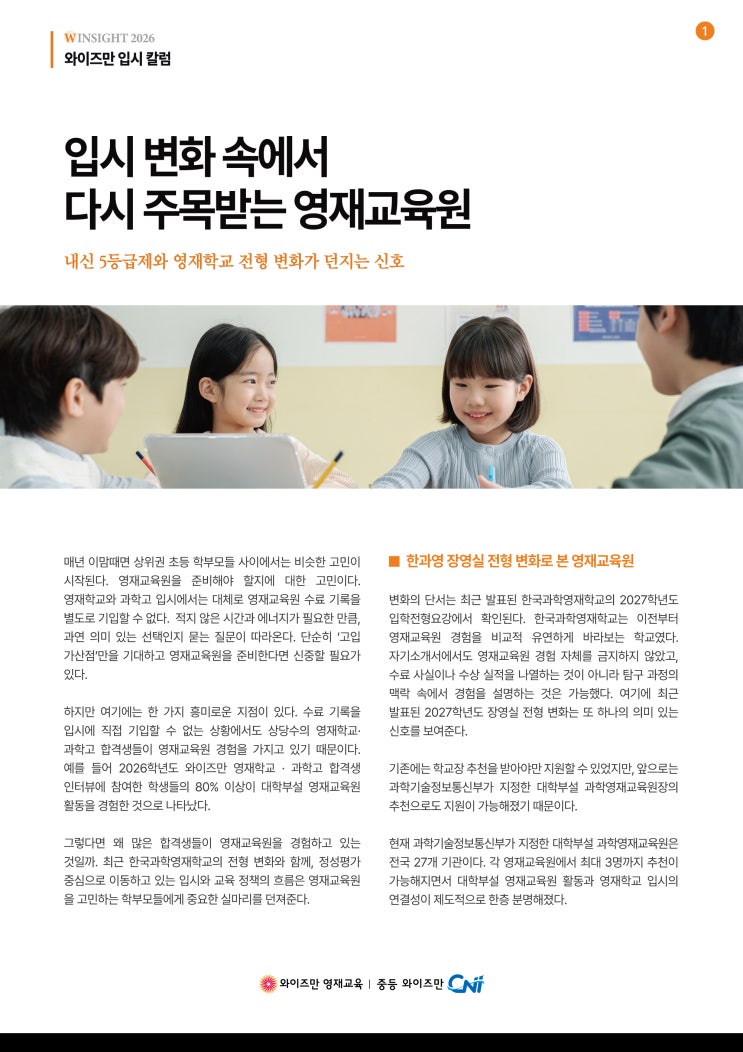 안녕하세요, 학부모님들 즐거움, 깨달음, 감동이 있는 교육을 지향하는 와이즈만 은평센터입니다 오늘은 입시 칼럼을 통해 최근 변화하는 교육 흐름과 그 속에서 영재교육원이 가지는 의미를 함께 살펴보려 합니다. 입시 변화가 보내는 신호 최근 발표된 교육 정책과 전형 변화를 보면 입시의 방향이 분명하게 바뀌고 있습니다. 특히 ✔ 내신 5등급제 도입 ✔ 2022 개정 교육과정 적용 ✔ 영재학교 전형 변화 이 세 가지는 단순한 변화가 아니라 학생 평가 방식 자체가 달라지고 있다는 신호입니다 기록보다과정을 본다 이번 칼럼에서 주목할 부분은 영재교육원 경험을 바라보는 시선의 변화입니다. 과거에는 영재교육원 수료....... <img src="https://blogthumb.pstatic.net/MjAyNjA0MTZfMjM5/MDAxNzc2MzE1MTAyMzgy.AaGa-riZBUG2up24PWO5WXV-gEJLNHHhrzDOElLlbM4g.Dmdw-71Wke7edo_xwTIKV2Lomr7LyyKPV7rJuUUqe3gg.JPEG/260409_%BF%CD%C0%CC%C1%EE%B8%B8-%C4%AE%B7%B3%284%BF%F9%29%281%29.jpg?type=s3" />