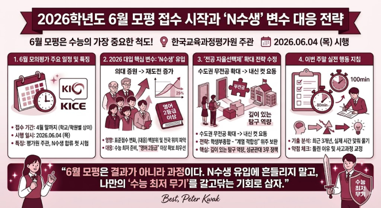 오늘 오전, 한국교육과정평가원에서 2026학년도 수능 6월 모의평가 시행계획을 발표했다. 이번 6월 모평은 단순한 연습이 아니라, 의대 증원과 전공 자율선택제(무전공) 확대가 처음으로 적용되는 입시 판도를 읽을 수 있는 가장 중요한 척도이다. 1. 6월 모의평가 주요 일정 및 특징 접수 기간: 2026년 4월 말까지 (학교 및 학원별 상이) 시행 일시: 2026년 6월 4일(목) 특징: 수능 출제 기관인 평가원이 직접 주관하며, 졸업생(N수생)이 본격적으로 합류하는 첫 시험이다. 2. 2026 대입의 핵심 변수: 'N수생'의 유입 최근 1일간의 입시 데이터 분석 결과, 의대 정원 증원의 영향으로 상위권 대학 재학생들의 '반수' 및 &#x....... <img src="https://blogthumb.pstatic.net/MjAyNjA0MjBfMTUx/MDAxNzc2NjQwMzc5NDI1.lqXmdT5ugtdDptSmJLU36LuqqClxIgULgKIO3nF3kNYg.wWy6uikySbUxuRB3MqiWnMZHhFsS_FaXgDFs3K6d8-0g.PNG/image.png?type=s3" />