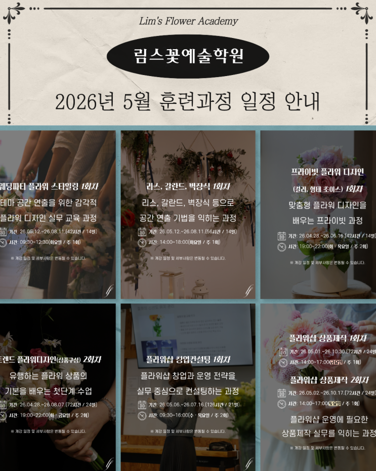 나를 위한 온전한 시간, 5월 훈련과정 일정 안내드립니다~! 바쁜 일상 속에서 잠시 숨을 고르고, 계절의 색을 담은 꽃들을 만지며 힐링하는 시간을 가져보세요~ 2026 림스꽃예술학원 강의 일정 모든 수업은 꽃 재료비가 포함된 금액이며 유형별 자비부담금이 상이하오니 자세한 내용은 고용24에서 확인 부탁드립니다! 내일배움카드 발급, 신청 방법 & 고용24 온라인 수강신청 이용 매뉴얼 ✨ ℒ' #림스 나이스 클래스 ️ 꽃과 함께하는 특별한 일상 #림스꽃예술학원 ️ https://link.inpock.co.kr/limsfloweracademy 검색창에 ‘림스꽃예술학....... <img src="https://blogthumb.pstatic.net/MjAyNjA0MjNfMTE4/MDAxNzc2OTMyNzE4NTI4.iB46UkRhKX-CLvbM1Wtl99_ky2ONrZXe9VUJ3l8bJsog.dW6ElfFKOF29D_bNr86-IJo8DSZFhiBQ71r-c_c9AtUg.PNG/%C1%A6%B8%F1%C0%BB_%C0%D4%B7%C2%C7%D8%C1%D6%BC%BC%BF%E4..png?type=s3" />