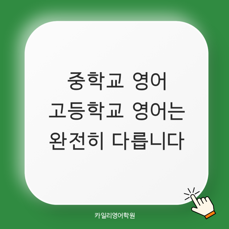 안녕하세요 카일리영어학원입니다 "우리 아이는 영어를 못하는 건 아닌데... 고등학교 와서 점수가 너무 떨어져요." 실제로 상담을 하다 보면 가장 많이 듣는 이야기 중 하나입니다. 중학교 시험에서는 90점 이상을 받는데 고등 모의고사만 보면 3-4등급으로 떨어지는 경우, 이건 절대 특별한 케이스가 아닙니다. 고등학생들에게 굉장히 흔하게 나타나는 현상입니다 중학교 vs 고등 모의고사 영어는 완전히 다릅니다 중학교 영어(내신)과 모의고사 영어는 평가 방식 자체가 다르다는 점입니다. [1] 중학교 영어 = '범위 + 암기 중심' - 교과서, 프린트, 학습지 -> 정해진 범위 - 본문 암기, 해석 암기, 문제 유형 반....... <img src="https://blogthumb.pstatic.net/MjAyNjA0MjBfMjc3/MDAxNzc2NjU5NzQyNzg4.CHn-LGi9Pfk0zl-8BiPLTxeU4T2kqZSH4XDsF3mPGGkg.s6gHD3eA3w-kZTCQ3ZUPrPWatnYBDTszpneePdVsvz8g.PNG/1.png?type=s3" />