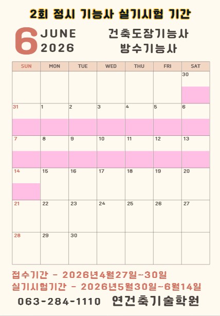 전주 건축도장기능사 학원 전주 방수기능사 학원 자격증 교육 전문 훈련기관 연건축기술학원입니다. 드디어 2회 기능사 정기시험 일정이 다가왔습니다. 시험접수기간 놓치지 않도록 미리미리 확인하세요 2026년 2회 기능사 시험일정은 언제? 원서접수 4월 27일 ~ 4월 30일 실기시험 5월 30일 ~ 6월 14일 합격발표 6월 26일 접수, 생각보다 빨리 마감됩니다 기능사 시험은 원하는 날짜 원하는 지역 이게 중요합니다. 하지만 늦게 접수하면 자리 없음 시험장 선택 제한 이런 경우 정말 많습니다 접수 전에 꼭 준비하세요 큐넷 회원가입 사진 등록 기본 정보 입력 접수 당일에 하면 늦습니다 지금부터 준비해야 하는 이유 건축도장기능사, 방수기능....... <img src="https://blogthumb.pstatic.net/MjAyNjA0MjFfNjQg/MDAxNzc2NzMwNjc1NjM4.7T9_qJltKVDVrcE71S7CsngjKk18wrZZ2Y5lLJfQzIIg.lV5MVJB8b4LJhQBAy3yMcH_mLCCsXamdoQ454cnC8GUg.JPEG/%BD%C7%B1%E2%BD%C3%C7%E8%B1%E2%B0%A3.JPG?type=s3" />