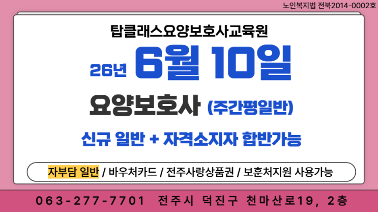 제2의 인생! 나이많아도 딸수 있다! 전주 요양보호사 #26년 평일반 #조기마감 예상 #송천동 #탑클래스교양보호사교육원 #송천탑클래스
