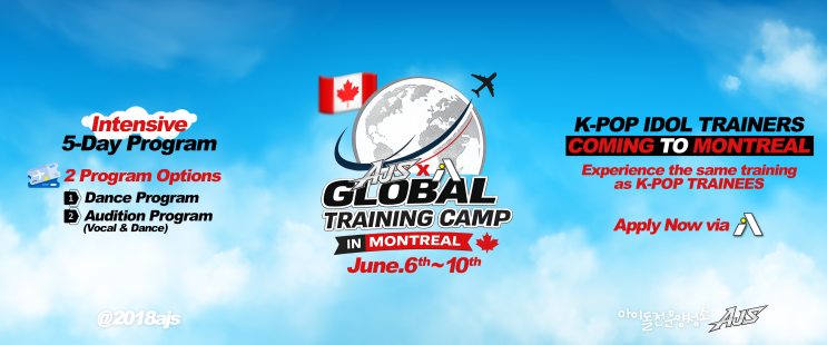 캐나다 몬트리올에서 @allpodiumdance_mtl과 함께 AJS 글로벌 트레이닝 캠프 개최! ✨ 실제 대형 기획사 K-POP 연습생들의 트레이닝 시스템을 직접 경험할 수 있는 기회! AJS Global Training Camp in Montreal, Canada in collaboration with @allpodiumdance_mtl ✨ A unique opportunity to experience the real training system of K-POP trainees from major entertainment companies! June 6–10 (5 days) See you at our intensive training camp! ------------------------------------------------------- ⚠️아전소에서만 경험할 수 있는 특별함, 아전소 시그니처 트레이닝! ✨다른 곳에서는 절대 경험할 수 없....... <img src="https://blogthumb.pstatic.net/MjAyNjA0MjlfMjk3/MDAxNzc3NDE1NzMwNzAw.ZlTdikg6aRrTqgi6ulvgZw5ACwQXXEccbEJVTzQ3Xv8g.wk3Uuk33E0f5JoBpNAU_8Z2CGQrtYTzde8l84etS7gAg.PNG/fff.png?type=s3" />
