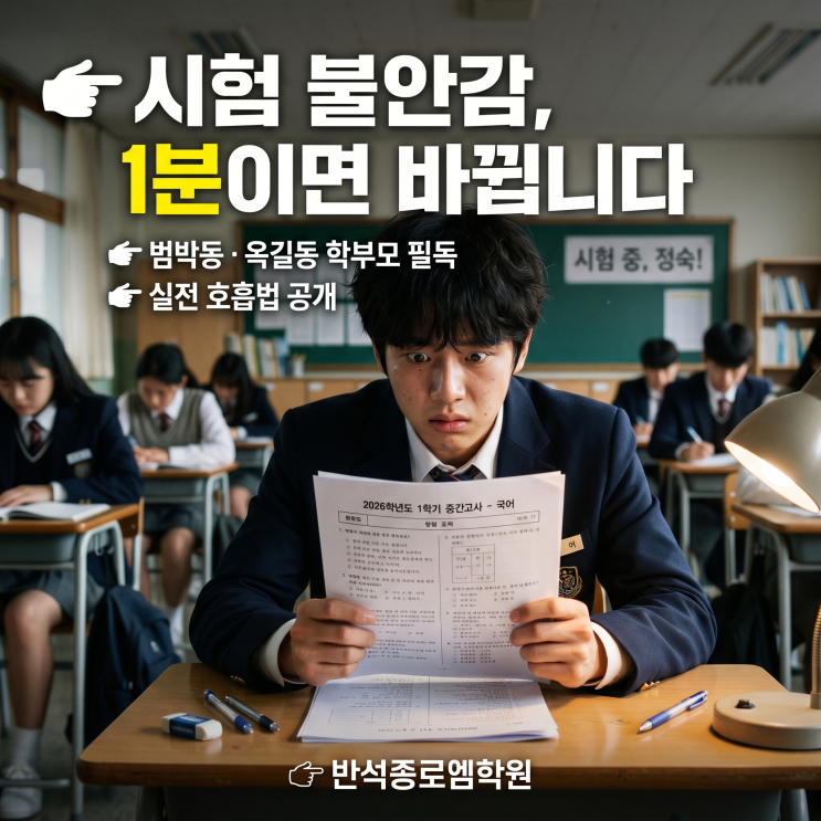 시험지만 보면 머리가 하얘져요 실전 불안감(Test Anxiety) 극복 호흡법 안녕하세요. 부천 범박동, 옥길동 학생들의 실력은 물론 흔들리는 멘탈까지 단단하게 잡아주는 교육 멘토, 반석종로엠학원입니다. "집에서 풀 때는 다 맞았는데, 학교에서 시험지만 받으면 글씨가 튕겨 나가고 머리가 하얗게 변해요." 시험 기간이 되면 이런 고민을 토로하며 눈물짓는 아이들이 참 많습니다. 학부모님들께서도 "우리 아이가 새가슴이라서, 멘탈이 약해서 큰일이다"라며 안타까워하시죠. 하지만 학부모님, 시험지 앞에서 머리가 하얘지는 것은 아이의 의지력이 약해서가 아닙니다. 뇌과학적으로 아주 자연스러운 '실전 불안감(Tes....... <img src="https://blogthumb.pstatic.net/MjAyNjA0MTVfMjMg/MDAxNzc2MjA3NTYxMzQ4.hJBG7cE_JiV0zU72Sz5XeaCWojdxsEezDKQMakhYogAg.VxcZPa2cv6t_PCiD2fbkoVfPI8WLjLOm4_LiXLu1WG4g.PNG/4%BF%F9%BD%C3%C7%E8-1.png?type=s3" />