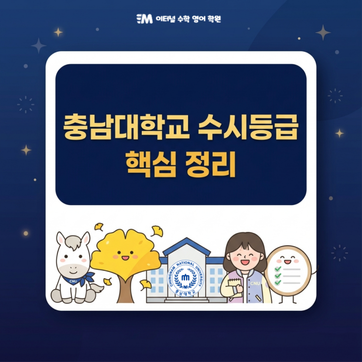 충남대학교 수시는 단순히 등급만 보고 판단하면 실제 결과와 차이가 생기는 경우가 많습니다. 안녕하세요. 미장동 이터널 수학 영어 학원입니다. 오늘은 충남대학교 수시등급 2026을 기준으로 전형별 특징과 실제 준비 방향을 정리해보겠습니다. 1. 충남대학교 수시 구조, 교과와 학종의 차이를 먼저 이해해야 한다 충남대학교 수시는 크게 학생부교과와 학생부종합전형으로 나뉩니다. 교과는 내신 중심, 학종은 서류와 면접 중심입니다. 같은 대학이지만 평가 방식이 다르기 때문에 충남대학교 수시등급 2026은 전형별로 따로 해석해야 합니다. 특히 교과전형은 비교적 정량적인 기준으로 선발되기 때문에 일정한 흐름이 유지되는 반면, 학생부....... <img src="https://blogthumb.pstatic.net/MjAyNjA0MjBfMjE1/MDAxNzc2NjUwNjYwNTc3.t4kBKaOxoxU5JEUlt8PHd6ixQpjtLXrrbn5GwJwGyeog.7xQ7BJhVvBf0YlbiU07BJkhn8ysiH6LMgUVC2IKeTNwg.PNG/%C3%E6%B3%B2%B4%EB%C7%D0%B1%B31.png?type=s3" />