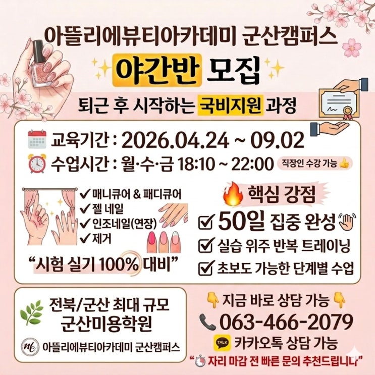 안녕하세요. 아뜰리에뷰티아카데미 군산캠퍼스입니다. 요즘 수강 문의를 보면, “네일 자격증, 지금 시작해도 될까요?”라는 질문을 정말 많이 받아요. 솔직히 말씀드리면… 시작은 빠를수록 좋습니다 특히 실기 위주로 제대로 배우면, 생각보다 훨씬 빨리 결과가 나오거든요. 오늘 소개해 드릴 과정은 국비지원으로 부담은 줄이고, 기술은 제대로 배워가는 과정입니다. * 교육기간 2026.04.24 ~ 09.02 * 수업시간 야간반 (월·수·금) 18:10 ~ 22:00 퇴근 후에도 충분히 가능한 시간대라 직장인분들도 가능하세요.^^ 이런 내용 배워요 매니큐어 & 패디큐어 젤 네일 인조네일(연장) 인조네일 제거 자격증 시험에 필요한 실....... <img src="https://blogthumb.pstatic.net/MjAyNjA0MjBfMzAw/MDAxNzc2NjcxMzExMDI0.CRlisigWGXELrtokWpFCZdleczVZiTeWNPrE9qeFlDEg.5MoaAtUPEZc1dYUETjhsHGIzHcPfqc1WzqLxyFl3RVUg.JPEG/KakaoTalk_20260420_163721133.jpg?type=s3" />
