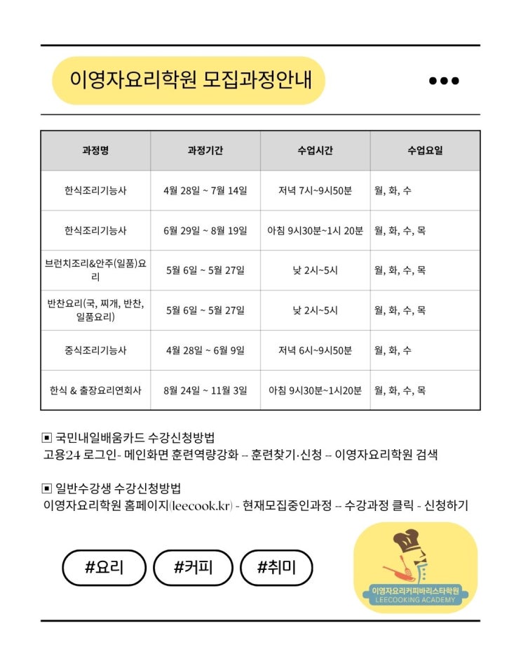 문의가 많아 교육일정을 안내드립니다 요즘 교육 일정에 대한 문의가 꾸준히 이어지고 있어 이렇게 정리해서 안내드리게 되었어요. 저희 수업은 한 분 한 분의 이해도와 실습 집중도를 높이기 위해 소수 정예로 운영되고 있습니다. 단순히 배우는 시간이 아니라, 직접 만들고 익히며 내 것으로 만드는 시간에 더 가치를 두고 있어요. 그만큼 정원이 빠르게 마감되는 편이라 신청을 고민하고 계셨다면 조금 서둘러주시는 것을 추천드립니다. 따뜻하고 밀도 있는 배움의 시간, 이번 기회에 함께하셨으면 좋겠습니다 #요리학원 #쿠킹클래스 #소수정예 #요리배우기 #집밥수업 #취미요리 #요리초보 #클래스모집 #선착순마감 #요리교육 <img src="https://blogthumb.pstatic.net/MjAyNjA0MjFfMjM4/MDAxNzc2NzMzNTYwNDY2.Ff-9dAtrMXwwp47RZObNES9bP0zmeZ59BQ-4LCKrDX0g.tRhMlI0yHmCr19JYtdt6aKpPPN7bmTd306iS3kN-c-gg.JPEG/%C8%AD%C0%CC%C6%AE_%BA%ED%B7%A2_%BD%C9%C7%C3%C7%D1_%BF%C0%B4%C3%C0%C7_%C7%D9%BD%C9_%B4%BA%BD%BA_%C4%AB%B5%E5%B4%BA%BD%BA_%C0%CE%BD%BA%C5%B8%B1%D7%B7%A5_%C6%F7%BD%BA%C6%AE.jpg?type=s3" />