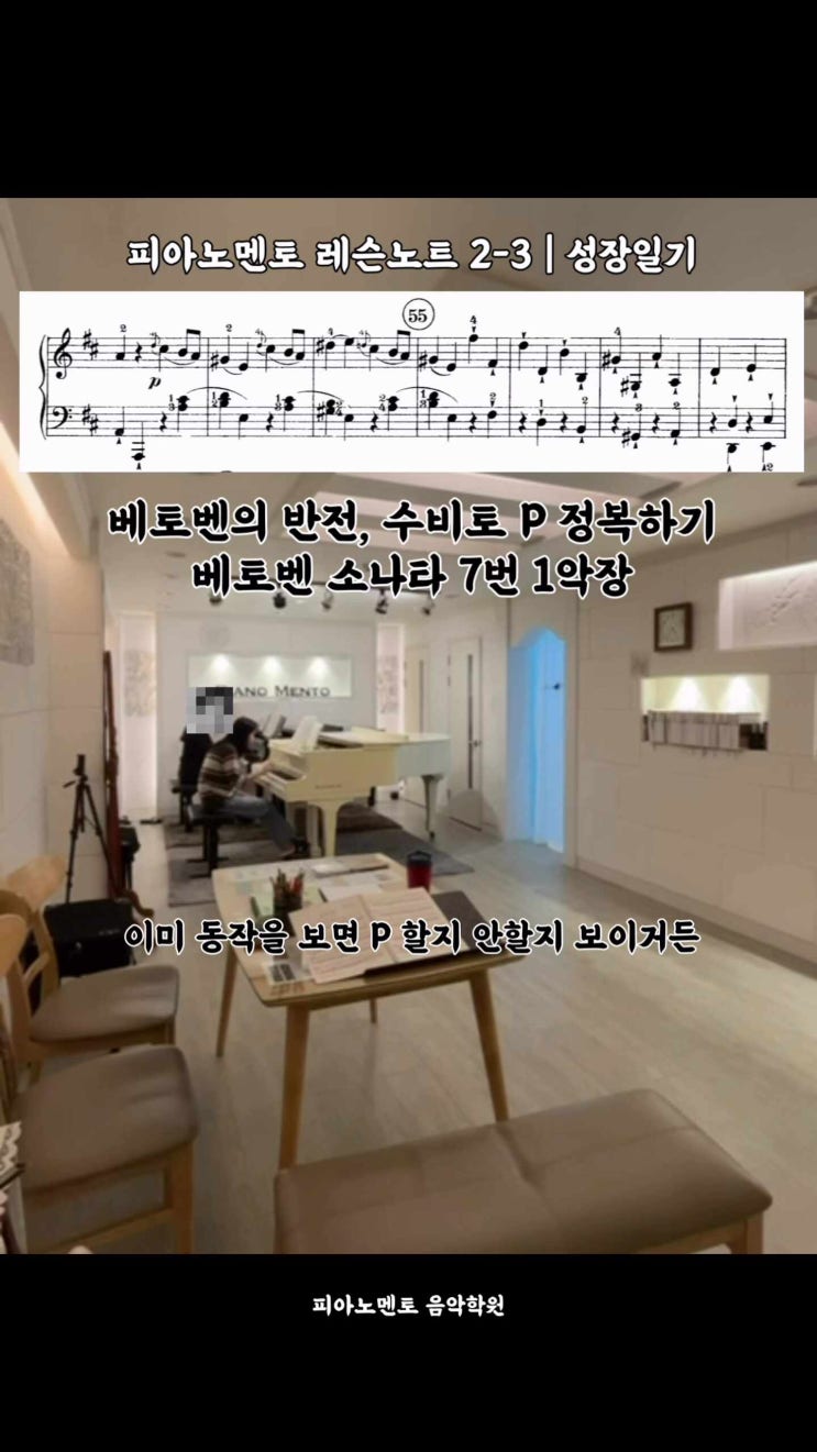 [피아노멘토 레슨노트 2-3] 베토벤 소나타 subito p 정복하기 안녕하세요 피아노멘토 원장 김지원입니다. 지난 글에서 “악상기호는 단순한 번역이 아니라 곡의 이미지와 분위기를 읽는 단서"라는 이야기를 나누었습니다. ⬇️ 아직 못 보신 분들은 이전 글을 통해 ‘소리를 상상하는 법'에 대해 먼저 읽어보시길 권합니다. 오늘은 그 연장선에서 실제 레슨 현장에서 학생들이 가장 어려워하는 구체적인 레슨 사례를 가져왔습니다. 바로 베토벤 소나타 7번 1악장에 등장하는 'subito p(갑자기 피아노)'입니다. - 관념을 깨는 베토벤의 p 우리는 보통 p = 여리게라고 번역합니다. 하지만 베토벤의 음악에서 이 기호를 만....... <img src="https://phinf.pstatic.net/image.nmv/blog_2026_04_16_3422/NOiQqvPNNQ_03.jpg?type=f480x480" />