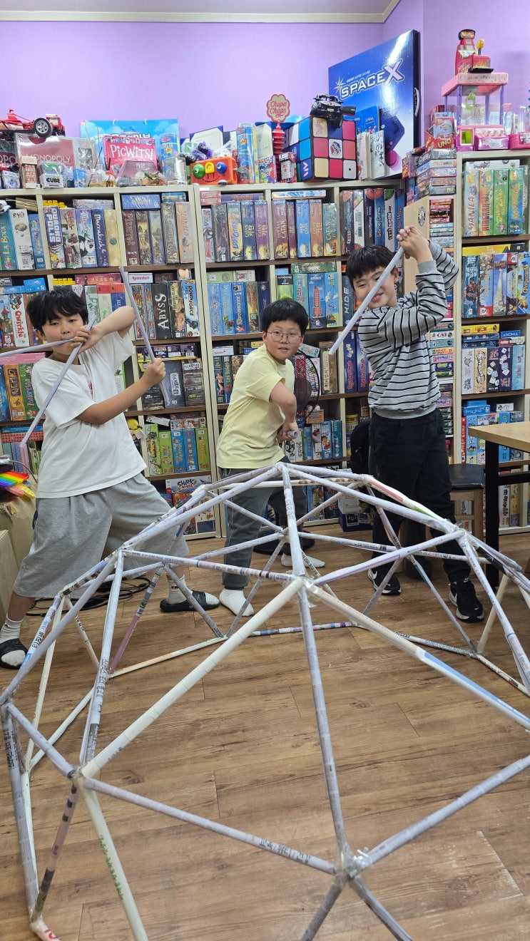 교육청등록번호 제2024호 가르치는 교육이 아닌 하고 싶게 만드는 교육을 실현하는... 놀면서...만지면서...체험하며 깊어지는 다이스큐브 창의체험수학교육연구소입니다. 다이스큐브 아이들과 함께 신나는 지오돔 만들기... 둘레가 같을때 가장 넓은 구조가 원 구조인거 다들 알고 계시죠? 입체적으론 구의 구조가 가장 넓겠죠,,, 또 아치구조의 원리 알고계시죠? 평면에서의 원과 아치구조를 입체로 확장해낸 반구형태의 구조물 '돔' 구조물 공간 활용성이 넓은 튼튼한 구조물 지오데식 돔 구조물을 지난시간 빨대를 활용하여 미니 지오데식돔을 만들어보고 멋진 돔 구조물의 원리를 이해한 후 오늘은 드디어,,, 아이들과 신문지를 재....... <img src="https://blogthumb.pstatic.net/MjAyNjA0MjNfMTE2/MDAxNzc2OTU0MTU2NjMw.pBJtmPo4fEtc6svEjOAJw4q1tJem0IUgZ1gZhTsbQ5Eg.mim0raxaFxEqQj0oA7w0L9dehOKespEbXMRVuJaf_zgg.JPEG/KakaoTalk_20260423_213037613_04.jpg?type=s3" />