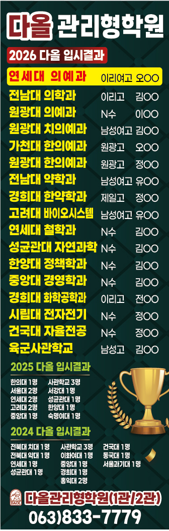 지방 지역에서 의치한약수(의대·치대·한의대·약대·수의대)를 목표로 하는 학생과 학부모님들 사이에서 가장 큰 고민은 역시 ‘내신은 좋은데 수능 최저를 맞출 수 있을까?’ 하는 점일 것입니다. 실제로 고등학교 1, 2학년 때 내신 1등급을 유지하며 승승장구하던 학생들이 고3이 되어 수능 최저 등급을 맞추지 못해 의학 계열 진학에 실패하는 사례가 매년 반복되고 있습니다. 왜 이런 일이 벌어지는 걸까요? 다올관리형학원에서 그 근본적인 원인과 확실한 해결책을 제시해 드립니다. 1. 내신 1등급의 함정, '우물 안 개구리'가 되지 마세요 내신 성적이 잘 나온다고 해서 자만심에 빠지는 순간이 가장 위험합니다. 좁은 시야에 갇혀....... <img src="https://blogthumb.pstatic.net/MjAyNjA0MjRfMTUw/MDAxNzc3MDEwNDEzMTkx.AihNkWgtNowHs5QUyV7FoGNWgUvokMQRkdu6ph3o8ycg.M40dSh22ZC_Ame3BAoP-cvONlBgCiwZvYTbDj-w_9QMg.PNG/image_%2814%29.png?type=s3" />
