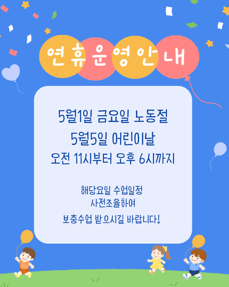 5월 1일 금요일 노동절과 5월 5일 화요일 어린이 날은 오전 11시부터 오후 6시까지 운영합니다. 해당 요일 수업 있으신 선생님들과 학생여러분은 사전 조율하여 보충수업 받으시길 바랍니다! <img src="https://blogthumb.pstatic.net/MjAyNjA0MjhfMjgz/MDAxNzc3MzY5MDA3OTM4.nv1GXLrfjBqUa9yfW6FyvoaiASKRE41jlmX_1c1H_PYg.Pc7zOr-5IrGdZE4BjfibLKO3JENHMO1zxX1DCNMd0NMg.PNG/%C1%A6%B8%F1%C0%BB_%C0%D4%B7%C2%C7%D8%C1%D6%BC%BC%BF%E4..png?type=s3" />