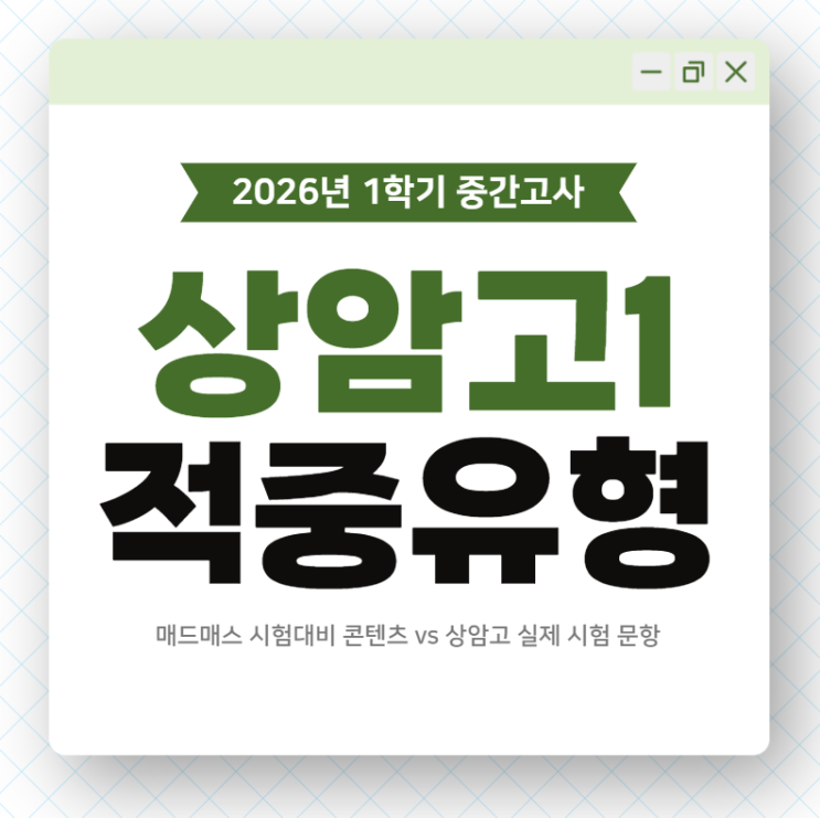 안녕하세요 :) 마포 매드매스 수학 전문학원입니다. 2026년의 첫 시험이었죠! 1학기 중간고사가 수학과목 시험이 막 종료되었는데요~ 매드교육의 교육 컨텐츠 (교재, 직전대비 FINAL 고사, 학교교과서 유형집 등) 그리고 실제 학교 시험에서의 문제들이 얼마나 유사했는지! 알아보는 시간을 가지도록 하겠습니다 :) 이번 시험에서는 단순히 문제의 겉모습만 닮은 것이 아니라 출제 의도, 정답을 도출해내는 방식까지 유사한 문제들이 많았습니다. 평소 상암고 수학학원에서의 수업을 집중해서 듣고 선생님이 이끌어주신대로 성실히 따라온 친구들이라면 좋은 결과를 기대해볼 수 있을 것 같습니다 ^^ 상암고 수학학원 중간고사 관련하여 더욱 많....... <img src="https://blogthumb.pstatic.net/MjAyNjA0MjRfMTkz/MDAxNzc3MDA0NzEwNjI3.sT7o7lLL4_7izBGO2vckY__xkdm0LMmD6ByGNU3peacg.WRR6PznWciBE170xvWVttk7IpwuNDZf1k_zFTuMcHjYg.PNG/image.png?type=s3" />