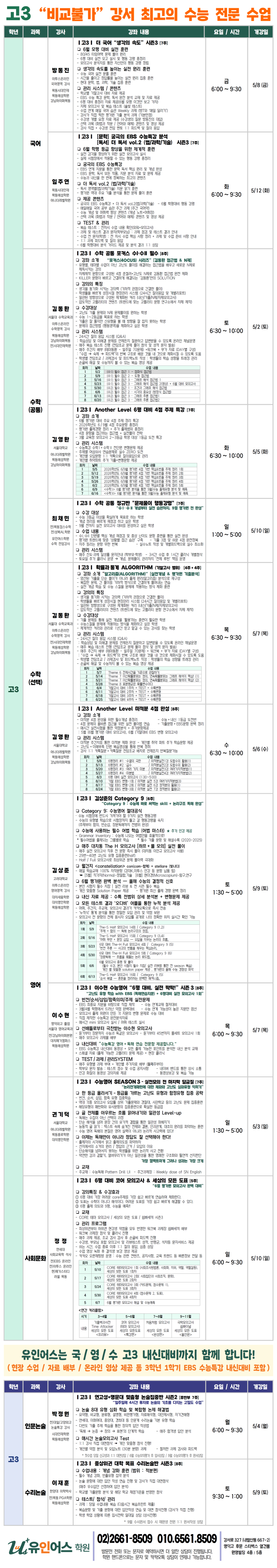 <고3> 5월 개강 시간표 2026 유인어스학원 (강서 발산 수능 국어 영어 수학 논술 사회문화) 명덕여고 명덕고 덕원여고 광영여고 마포고 화곡고 등촌고