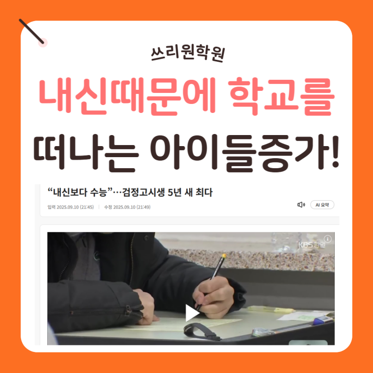 안녕하세요 쓰리원 학원입니다! 요즘 자녀 교육 문제로 고민이 참 많으시죠? 최근 교육계 소식을 접하다 보면 검정고시를 선택하는 학생들이 부쩍 늘었다는 이야기에 깜짝 놀라곤 합니다. 실제로 통계를 살펴보면 올해 고졸 검정고시 응시자가 최근 5년 중 가장 높은 수치를 기록했어요. 4년 전보다 12%나 증가한 수치인데, 특히 주목할 점은 만 18세 미만 청소년 비중이 40% 이상 급증했다는 사실입니다. 과거에는 피치 못할 사정으로 학업을 중단했다면, 이제는 대학 입시를 위한 전략적인 선택으로 학교를 떠나는 아이들이 많아진 것이죠. 원장으로서 이런 현실을 마주할 때마다 아이들이 짊어진 입시의 무게가 얼마나 무거울지 마음이 참 무....... <img src="https://blogthumb.pstatic.net/MjAyNjA0MTJfMTk5/MDAxNzc1OTczNzg2OTEy.OD--zNcXa-MMWMhJju_82BW4vlFpg5ZLYceBXXxFDY4g.PuO33rwgh837Wlr2s7g9c2JMLztzLgKJJu5CW8dgYREg.PNG/%B0%ED%B1%B3%C7%D0%C1%A1%C1%A6_%B0%CB%C1%A4%B0%ED%BD%C3%C1%F5%B0%A1-001.png?type=s3" />