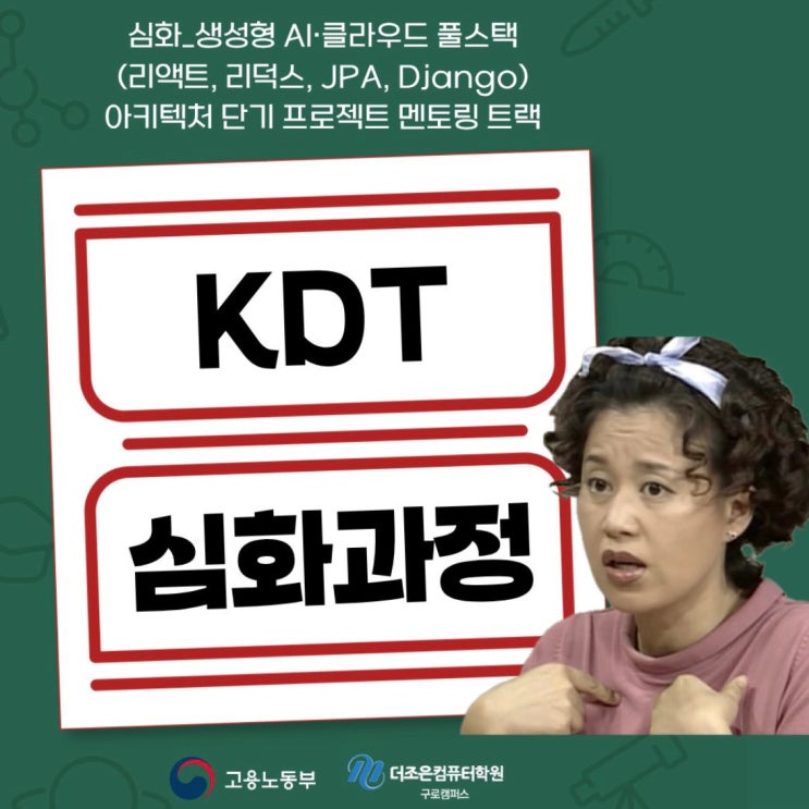 심화_생성형 AI·클라우드 풀스택 (리액트, 리덕스, JPA, Django) 아키텍처 단기 프로젝트 멘토링 트랙 요즘 개발자 취업, 단순히 한 가지 기술만으로는 부족합니다. 또한, AI를 활용할 줄 아는 역량은 이제 선택이 아닌 필수입니다. 프론트엔드, 백엔드, 데이터, AI까지 전체 흐름을 이해하는 인재가 확실히 경쟁력이 있습니다. 그래서 준비된 과정이 바로, 지금 소개하는 KDT심화 과정입니다 더조은구로 실무 중심 커리큘럼 이 과정은 단순 이론이 아니라, 실제 서비스 개발 흐름을 기준으로 구성 프론트엔드부터 API, DB까지 이어지는 풀스택 웹 아키텍처 구현 AWS 기반 인프라, Docker, Kubernetes까지 포함된 DevOp....... <img src="https://blogthumb.pstatic.net/MjAyNjA0MjRfMjAy/MDAxNzc3MDExNjY5ODYz.hCIe0MDeCoNI84_akL4a2-Jk_gmcHekWkpfDPUzv59Eg.OWqQWKwlbvQ2tyOqSSCh6nRo-Lb5QyBQ5dflrgdYw6Qg.JPEG/1.jpg?type=s3" />