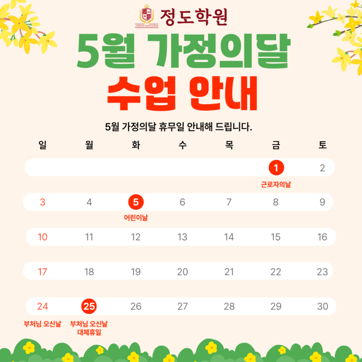 [5월 일정] 정도학원 5월 가정의달 휴강/수업 일정┃상모/사곡/임은/오태/광평/공단┃영수과학원/영어학원/수학학원/과학학원