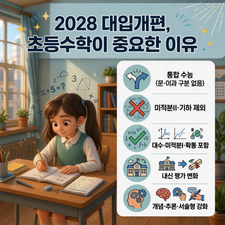 "2028 대입이 바뀐다던데, 우리 애는 몇 년생이야? 해당돼?" " 수능에서 미적분이 빠진다고 들었는데… 그럼 쉬워지는 거야?" "초등학교 때 수학을 어떻게 준비해야 돼?" 요즘 학부모님들 사이에서 꼭 나오는 이야기 중 하나입니다. 결론부터 말씀드리면 2028대입 개편은 단순한 수능 범위 조정이 아닙니다. 입시 구조 전체가 바뀌고 그에 대한 기초는 초등수학에서 시작되죠. 오늘은 사고력수학 시매쓰에서 2028대입개편 초등수학이 수능을 결정짓는 이유에 대해 정리해 볼게요. 2028 대입 개편, 누가 해당되나요? 2028 대입 개편은 2022 개정 교육과정이 적용되는 2025년 고등학교 신입생부터 적용되며, 수능은....... <img src="https://blogthumb.pstatic.net/MjAyNjA0MTdfMjM5/MDAxNzc2NDA5MzMyMzY1.IYJjZWeN7dfd9cccuelHur12AptT5DRhlKKJVxehpP0g.dVSPCLnk92T1zIEHOZ5Xqm0ltB9jfFrmYegk0Si4SiQg.PNG/ChatGPT_Image_2026%B3%E2_4%BF%F9_17%C0%CF_%BF%C0%C8%C4_04_01_57.png?type=s3" />