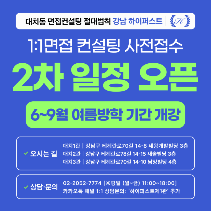 더 강력해진 1:1 면접 컨설팅, 6~9월 2차 일정 오픈! 안녕하세요, 하이퍼스트 학원입니다. 지난 3~5월 일정의 1차 개강 이후 1:1 면접 컨설팅 프로그램에 보내주신 수많은 관심과 성원에 감사드립니다. 2차 일정에 대한 학부모님 및 학생 여러분들의 요청에 부응하고자, 6월부터 9월까지의 2차 개강 일정을 확정하여 안내해드립니다. 여름방학 기간을 포함한 이번 2차 개강은 본격적인 입시 레이스를 달리기 위한 시작의 골든타임으로, 학생 개인 맞춤형 컨설팅이라는 특징에 맞게 선착순 접수로 운영되어 조기마감될 수 있습니다. 하이퍼스트의 1:1 면접 컨설팅은 학생의 개인별 서류/지원 대학 및 전형별 면접 특징을 현미경처럼 분석하여, 면....... <img src="https://blogthumb.pstatic.net/MjAyNjA0MjNfNDUg/MDAxNzc2OTExOTcwMTk1.T50YyQmMbtSmM7KCFaJzgD4Rq9a6DmgCWlVRL2VvTMsg.GZmjR01gYyZmrseyyALaVzi3gWtLmf7dUAivcxufji4g.PNG/2026_NEW-%B4%EB%C7%A5%C0%CC%B9%CC%C1%F6_%BC%B6%B3%D7%C0%CF-_%BA%B9%BB%E7%BA%BB.png?type=s3" />