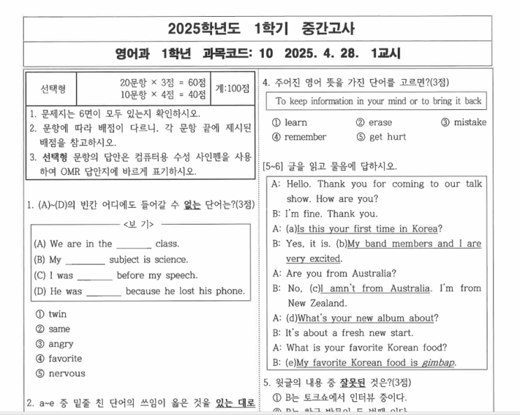 [심상민영어] 2025년 언주중1학년학기 중간 원본및 정답