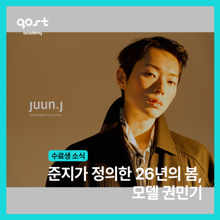 준지가 선택한 얼굴, 고스트아카데미 출신 모델 권민기 안녕하세요, 고스트 아카데미입니다! 오늘은 고스트 아카데미 4기 스탠다드를 수료하고 현재 다양한 분야에서 활발하게 활동 중인 모델 권민기의 특별한 소식을 전합니다. 준지가 정의한 2026년의 봄, 모델 권민기 juun.j (준지) 2026 스프링 컬렉션 화보의 중심에 고스트 아카데미 출신 모델 권민기가 섰습니다 . 국내외를 무대로 활동하는 디자이너 브랜드 준지의 시즌 컬렉션에서 그 시즌을 대표하는 얼굴로 선택된다는 것 — 그것이 얼마나 큰 의미인지는 말하지 않아도 알 것입니다. 정교한 테일러링 위에 자연스럽게 얹힌 민기 모델만의 무드. 카메라를 향한 시선 하나, 옷의 실루엣....... <img src="https://blogthumb.pstatic.net/MjAyNjA0MTdfMzQg/MDAxNzc2NDE0OTY3MDgw.L3TzdGWPZNhfm5v5W-raaMJgj0isnpas-RnPNMOhOk4g.hehxrPiZQUoTPamEklpK59tECkj1sHsAZjnXmncJXJ0g.PNG/%B1%C7%B9%CE%B1%E2_%C1%D8%C1%F6_%BD%E6%B3%D7%C0%CF.png?type=s3" />